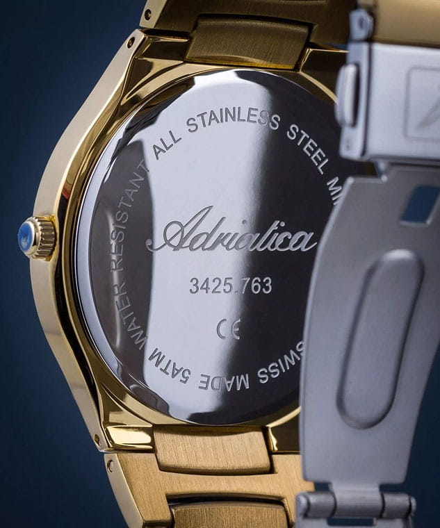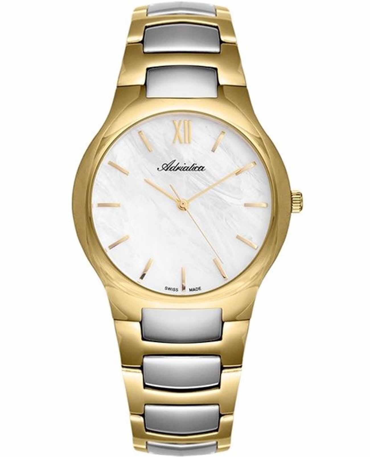 Часы Adriatica A3425.216FQ воплощают в себе утонченность и надежность швейцарского часового искусства. Эти часы идеально подойдут для тех, кто ценит стиль и качество в одном изделии. Перламутровый циферблат защищен минеральным стекломМинеральное стеклоМинеральное стекло представляет собой искусственно выращенный минерал кварца. Такое стекло отличается особой устойчивостью к повреждениям и царапинам. Уступает по некоторым качествам сапфировому стеклу. и заключен в корпус из нержавеющей стали с PVDPVDУльтратонкое покрытие наносится в технике вакуумного напыления, сочетает в себе нитрид титана особой прочности со слоем золота или оксида хрома. Несёт в себе декоративную или защитную функцию. покрытием цвета желтого золота, которое придает дополнительную прочность и элегантный вид. Часы оснащены кварцевым механизмом Ronda 763, обеспечивающим высокую точность и надежность. Водозащита 50WR делает их устойчивыми к воздействию воды, что позволяет не беспокоиться о случайных брызгах. Стальной браслет с частичным PVDPVDУльтратонкое покрытие наносится в технике вакуумного напыления, сочетает в себе нитрид титана особой прочности со слоем золота или оксида хрома. Несёт в себе декоративную или защитную функцию. покрытием цвета желтого золота с раскладной застёжкойРаскладная застёжкаТакой тип застёжки используется только на браслетах из металла. Она никогда не раскрывается полностью, происходит разделение на 2 и более частей. Раскладывающая застёжка снизит вероятность потери часов к минимуму. подчеркивает современный стиль и обеспечивает комфортное ношение.