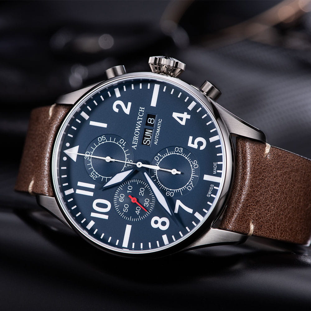 Мужские механические швейцарские часы-хронографХронографФункция позволяет измерять отрезки времени с особой точностью: часы, минуты, секунды. Верным признаком хронографа является наличие на циферблате 3 дополнительных окошек-счётчиков. с автоподзаводом Aerowatch Les Grandes Classiques Pilot 61989 AA05. Сапфировое стеклоСапфировое стеклоПрочный и надёжный материал из кристалла сапфира синтетического происхождения, характеризующийся особой твёрдостью и устойчивостью к царапинам и повреждениям. устойчивое к появлению царапин, обладающее высокой прозрачностью. Корпус изготовлен из нержавеющей стали. В часах установлен калибр Valjoux 7750 с 25ю камнями, доработанный мастерами Aerowatch. Механизм декорированый узором «côtes de Genève» и воронеными винтами имеет запас хода 42 часа. Циферблат украшают стрелки люминесцентным покрытиемЛюминесцентное покрытиеПозволяет считывать показания времени в темноте. Производители наносят на стрелки, часовые индексы, безель или поверхность циферблата светонакопительный состав, дающий холодное свечение., окошко даты и дня недели в положении 3 часов. Класс водозащиты: 50 метров, позволит защитить корпус от случайных брызг или капель дождя. Кожаный ремешок на стандартной застёжке.