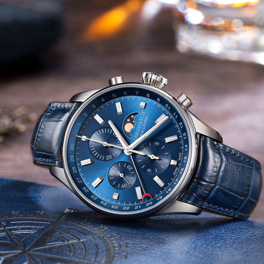 Мужские механические швейцарские часы-хронографХронографФункция позволяет измерять отрезки времени с особой точностью: часы, минуты, секунды. Верным признаком хронографа является наличие на циферблате 3 дополнительных окошек-счётчиков. с автоподзаводом Aerowatch Les Grandes Classiques Moon Phase 69989 AA03. Лимитированная серия 499 экземпляров.Сапфировое стеклоСапфировое стеклоПрочный и надёжный материал из кристалла сапфира синтетического происхождения, характеризующийся особой твёрдостью и устойчивостью к царапинам и повреждениям. устойчивое к появлению царапин, обладающее высокой прозрачностью. Корпус изготовлен из нержавеющей стали. В часах установлен калибр Valjoux 7750 с 25ю камнями. Механизм, декорированый узором «côtes de Genève» и воронеными винтами, имеет запас хода 42 часа. Циферблат украшают стрелки и метки с люминесцентным покрытиемЛюминесцентное покрытиеПозволяет считывать показания времени в темноте. Производители наносят на стрелки, часовые индексы, безель или поверхность циферблата светонакопительный состав, дающий холодное свечение., указание даты происходит с помощью стрелки, также на циферблате присутствует индикатор фаз луны. Регулировка фазы луны и даты происходит с помощью заводной головки. На левом боку корпуса указан лимитированный серийный номер. Класс водозащиты: 50 метров, позволит защитить корпус от случайных брызг или капель дождя. Кожаный ремешок на стандартной застёжке.