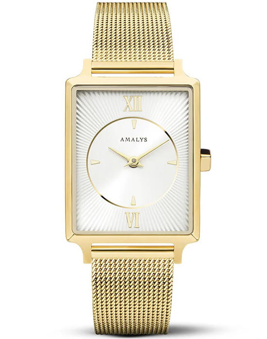 Amalys AMW-131 — женская модель с утончённой минималистичной эстетикой, где корпус с PVD-покрытиемPVDУльтратонкое покрытие наносится в технике вакуумного напыления, сочетает в себе нитрид титана особой прочности со слоем золота или оксида хрома. Несёт в себе декоративную или защитную функцию. размером 23 мм подчёркивает современный характер и чистоту линий. Механизм — точный кварцевый, обеспечивающий стабильный ход и надёжность в повседневном использовании. Поверхность циферблата оформлена в лаконичном стиле с тонкими метками и стрелками, создающими гармонию и визуальную лёгкость. Защитную функцию выполняет минеральное стеклоМинеральное стеклоМинеральное стекло представляет собой искусственно выращенный минерал кварца. Такое стекло отличается особой устойчивостью к повреждениям и царапинам. Уступает по некоторым качествам сапфировому стеклу., устойчивое к механическим воздействиям и сохраняющее читаемость при ежедневной носке. Браслет с PVD-покрытиемPVDУльтратонкое покрытие наносится в технике вакуумного напыления, сочетает в себе нитрид титана особой прочности со слоем золота или оксида хрома. Несёт в себе декоративную или защитную функцию. выполнен в виде «миланской сетки» шириной 14 мм, оснащён раскладным замкомРаскладной замокДанный вариант застежки используется только на часах с металлическим браслетом. Отличительная особенность такого крепления в том, что длина браслета становится универсальной и вы можете самостоятельно отрегулировать нужный вам размер – застежка просто двигается по браслету часов., его гибкая структура обеспечивает комфортное прилегание к запястью и визуальную утончённость. Единство корпуса и браслета создаёт целостный образ, а изысканная простота дизайна делает модель универсальной — она одинаково уместна и в деловой обстановке, и в повседневных сочетаниях.