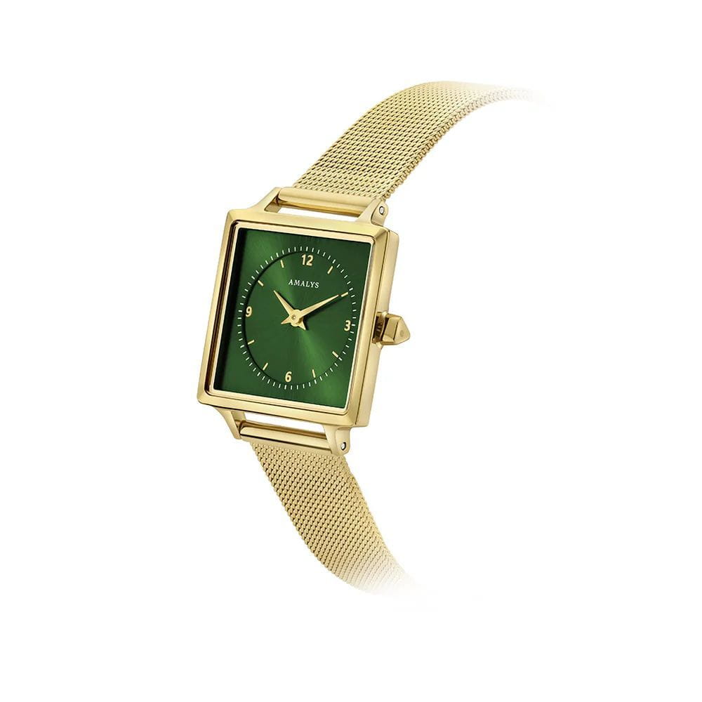 Amalys AMW-136 — женская модель с утончённой минималистичной эстетикой, где квадратный корпус с PVD-покрытиемPVDУльтратонкое покрытие наносится в технике вакуумного напыления, сочетает в себе нитрид титана особой прочности со слоем золота или оксида хрома. Несёт в себе декоративную или защитную функцию. размером 25 мм подчёркивает современный характер и чистоту линий. Механизм — точный кварцевый, обеспечивающий стабильный ход и надёжность в повседневном использовании. Поверхность циферблата оформлена в лаконичном стиле с тонкими метками и стрелками, создающими гармонию и визуальную лёгкость. Защитную функцию выполняет минеральное стеклоМинеральное стеклоМинеральное стекло представляет собой искусственно выращенный минерал кварца. Такое стекло отличается особой устойчивостью к повреждениям и царапинам. Уступает по некоторым качествам сапфировому стеклу., устойчивое к механическим воздействиям и сохраняющее читаемость при ежедневной носке. Браслет с PVD-покрытиемPVDУльтратонкое покрытие наносится в технике вакуумного напыления, сочетает в себе нитрид титана особой прочности со слоем золота или оксида хрома. Несёт в себе декоративную или защитную функцию. выполнен в виде «миланской сетки» шириной 14 мм, оснащён раскладным замкомРаскладной замокДанный вариант застежки используется только на часах с металлическим браслетом. Отличительная особенность такого крепления в том, что длина браслета становится универсальной и вы можете самостоятельно отрегулировать нужный вам размер – застежка просто двигается по браслету часов., его гибкая структура обеспечивает комфортное прилегание к запястью и визуальную утончённость. Единство корпуса и браслета создаёт целостный образ, а изысканная простота дизайна делает модель универсальной — она одинаково уместна и в деловой обстановке, и в повседневных сочетаниях.