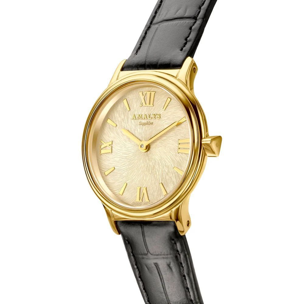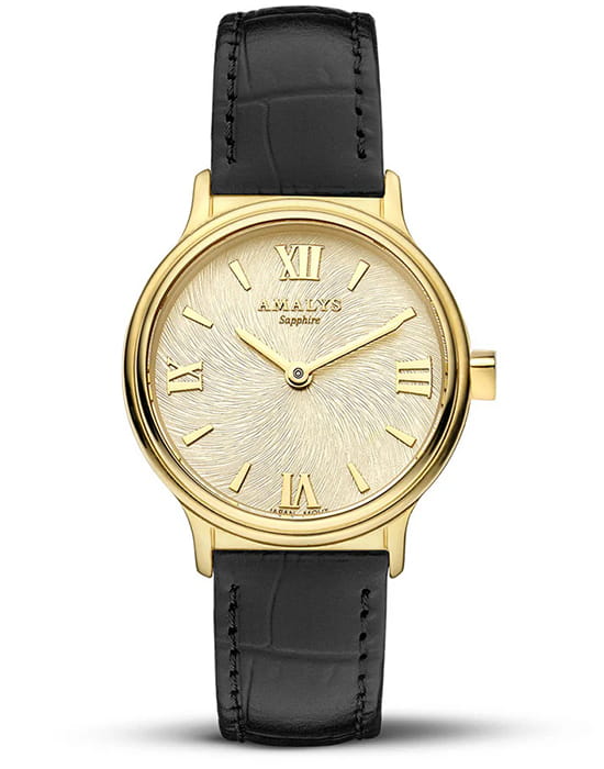 Amalys AMW-165 — женская модель с утончённым классическим дизайном, в которой сочетаются элегантность и практичность. Круглый корпус с PVD-покрытиемPVDУльтратонкое покрытие наносится в технике вакуумного напыления, сочетает в себе нитрид титана особой прочности со слоем золота или оксида хрома. Несёт в себе декоративную или защитную функцию. диаметром 28 мм выполнен из нержавеющей стали, гармонирующим с ремешком шириной 14 мм в том же исполнении. Защитную функцию выполняет сапфировое стеклоСапфировое стеклоПрочный и надёжный материал из кристалла сапфира синтетического происхождения, характеризующийся особой твёрдостью и устойчивостью к царапинам и повреждениям., стойкое к царапинам и сохраняющее прозрачность. Механизм — кварцевый, обеспечивающий точность и стабильность хода. Кожаный ремешок на стандартной застежке, который сочетает надёжность фиксации и удобство повседневного использования. Водозащита 5 ATM защищает часы от случайных брызг и дождя. Циферблат с римскими индексами и изящными стрелками подчёркивает классическую эстетику модели, делая её уместной как в повседневных образах, так и в торжественной обстановке.
