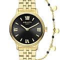 Amalys AMW-198 — женский набор, включающий часы и браслет, выполненный в гармоничном стиле. Круглый корпус диаметром 28 мм изготовлен из нержавеющей стали с PVDPVDУльтратонкое покрытие наносится в технике вакуумного напыления, сочетает в себе нитрид титана особой прочности со слоем золота или оксида хрома. Несёт в себе декоративную или защитную функцию.-покрытием тёплого золотистого оттенка, а браслет шириной 14 мм обеспечивает комфортное прилегание и подчёркивает изящный образ. Защитную функцию выполняет сапфировое стеклоСапфировое стеклоПрочный и надёжный материал из кристалла сапфира синтетического происхождения, характеризующийся особой твёрдостью и устойчивостью к царапинам и повреждениям., устойчивое к царапинам и сохраняющее прозрачность. Механизм — кварцевый, надёжный и точный. Браслет с PVDPVDУльтратонкое покрытие наносится в технике вакуумного напыления, сочетает в себе нитрид титана особой прочности со слоем золота или оксида хрома. Несёт в себе декоративную или защитную функцию.-покрытием снабжён раскладным замкомРаскладной замокДанный вариант застежки используется только на часах с металлическим браслетом. Отличительная особенность такого крепления в том, что длина браслета становится универсальной и вы можете самостоятельно отрегулировать нужный вам размер – застежка просто двигается по браслету часов., что делает ношение удобным и безопасным. Водозащита 5 ATM предохраняет модель от случайных брызг и дождя. Циферблат с римскими индексами и утончённым декоративным узором придаёт часам элегантность, а комплектный браслет завершает цельный и женственный образ.