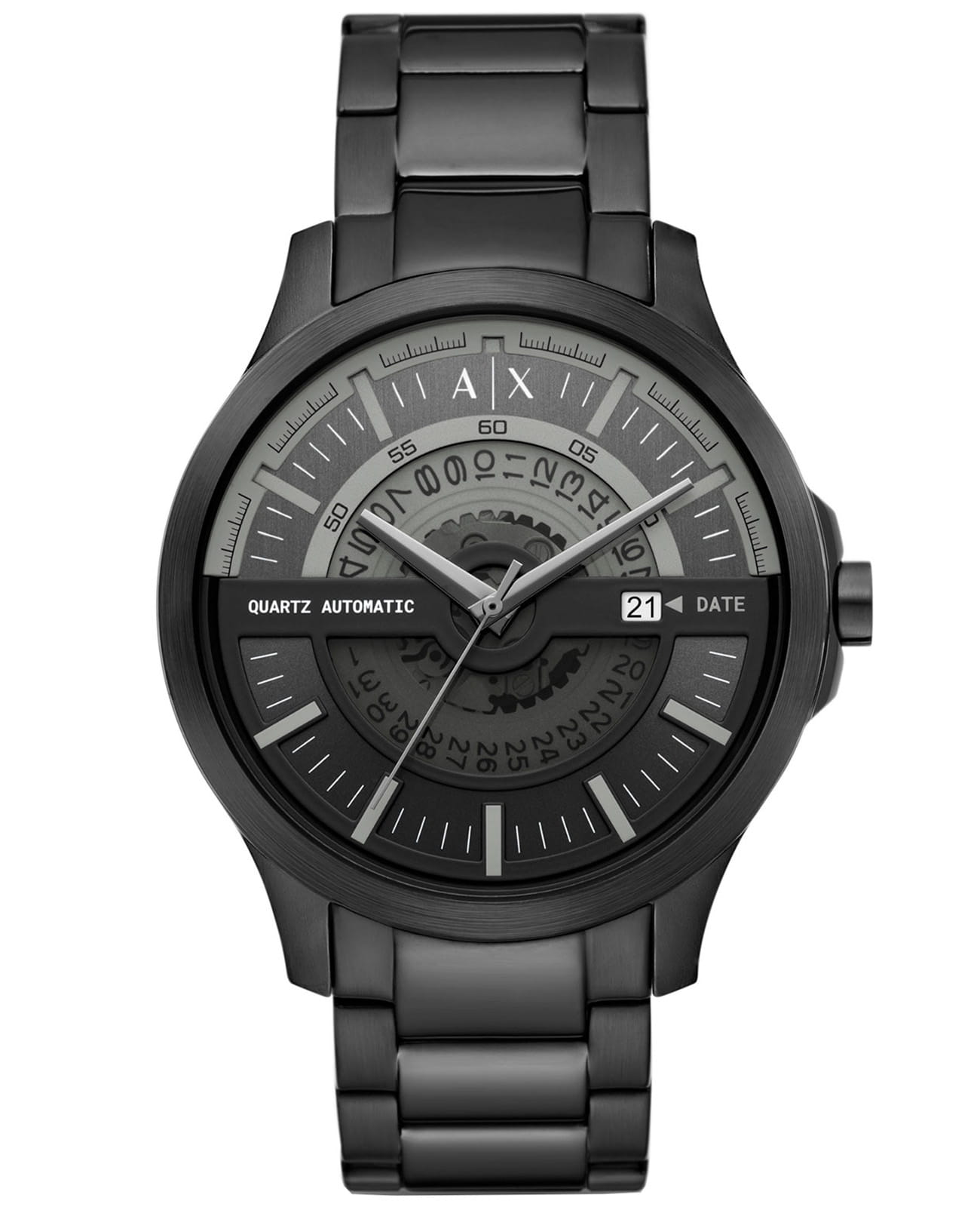 Мужские наручные часы с минеральным стекломМинеральное стеклоМинеральное стекло представляет собой искусственно выращенный минерал кварца. Такое стекло отличается особой устойчивостью к повреждениям и царапинам. Уступает по некоторым качествам сапфировому стеклу. Armani Exchange Hampton AX2444, кварцевый механизм с высокой точностью. Класс водозащиты: 50 метров, позволит защитить корпус от случайных брызг или капель дождя. Корпус и браслет часов изготовлены из стали с IP-покрытиемIP-покрытиеМетод ионного напыления. Демонстрирует повышенную устойчивость к истиранию, окислению и химическим веществам. Под воздействием высокого давления и температуры около 1500°C молекулы металла надёжно соединяются с частицами корпуса часов. черного цвета. Браслет с раскладной застёжкойРаскладная застёжкаТакой тип застёжки используется только на браслетах из металла. Она никогда не раскрывается полностью, происходит разделение на 2 и более частей. Раскладывающая застёжка снизит вероятность потери часов к минимуму.. Метки в виде штрихов. Окошко даты в положении 3 часа.