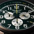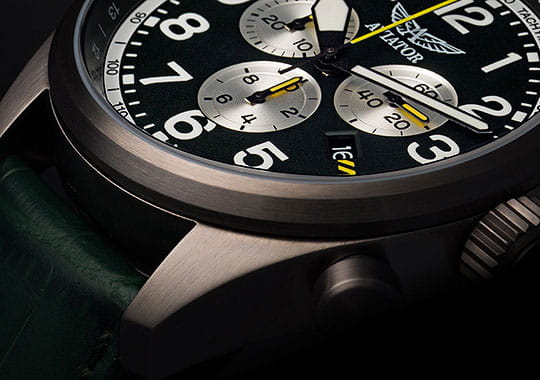 Циферблат оформлен в классическом aviator-стиле: крупные арабские цифры, широкие стрелки и чёткое деление минут позволяют считывать время мгновенно. Стрелки и метки покрыты люминесцентным покрытиемЛюминесцентное покрытиеПозволяет считывать показания времени в темноте. Производители наносят на стрелки, часовые индексы, безель или поверхность циферблата светонакопительный состав, дающий холодное свечение. для отличной читаемости при слабом освещении.