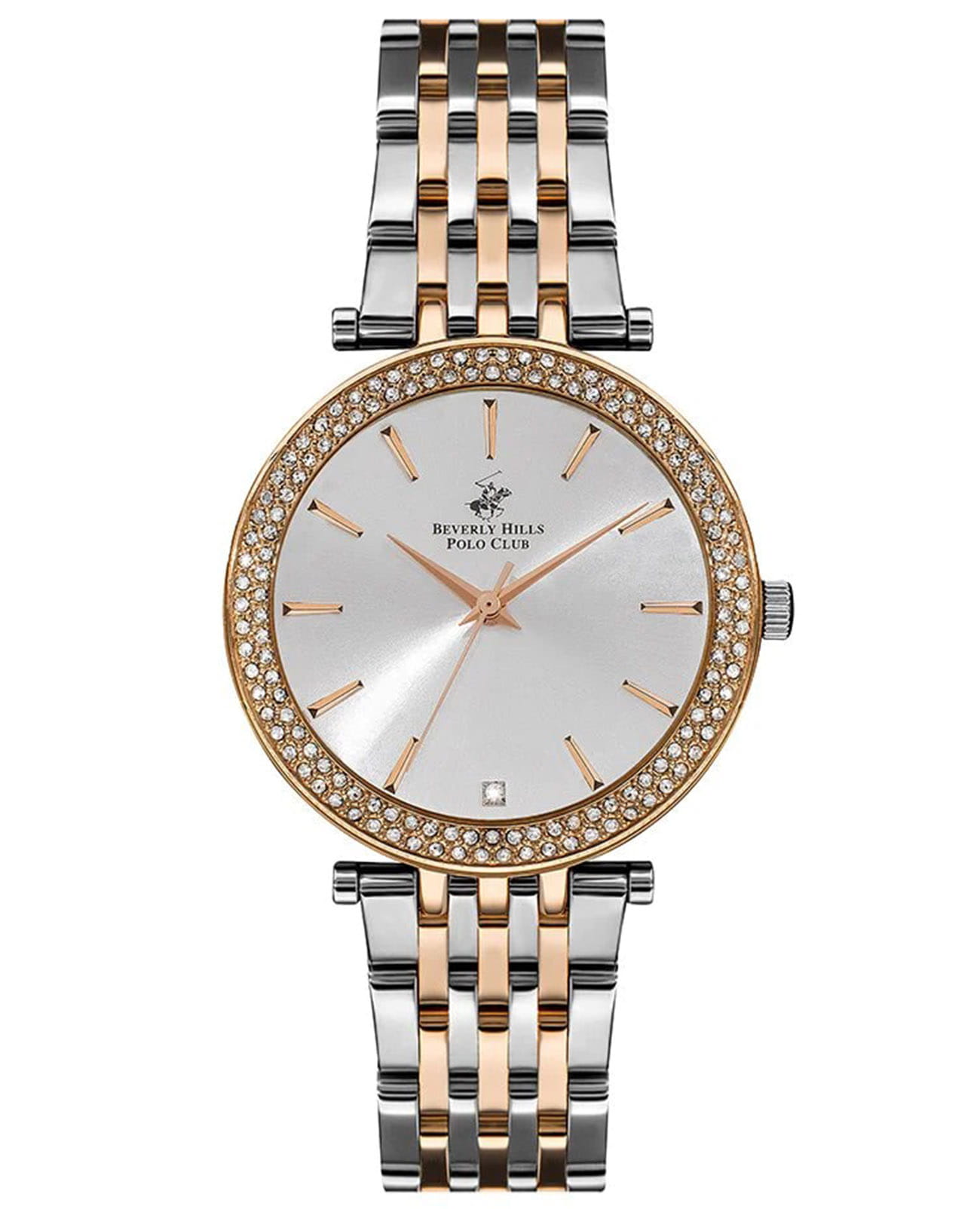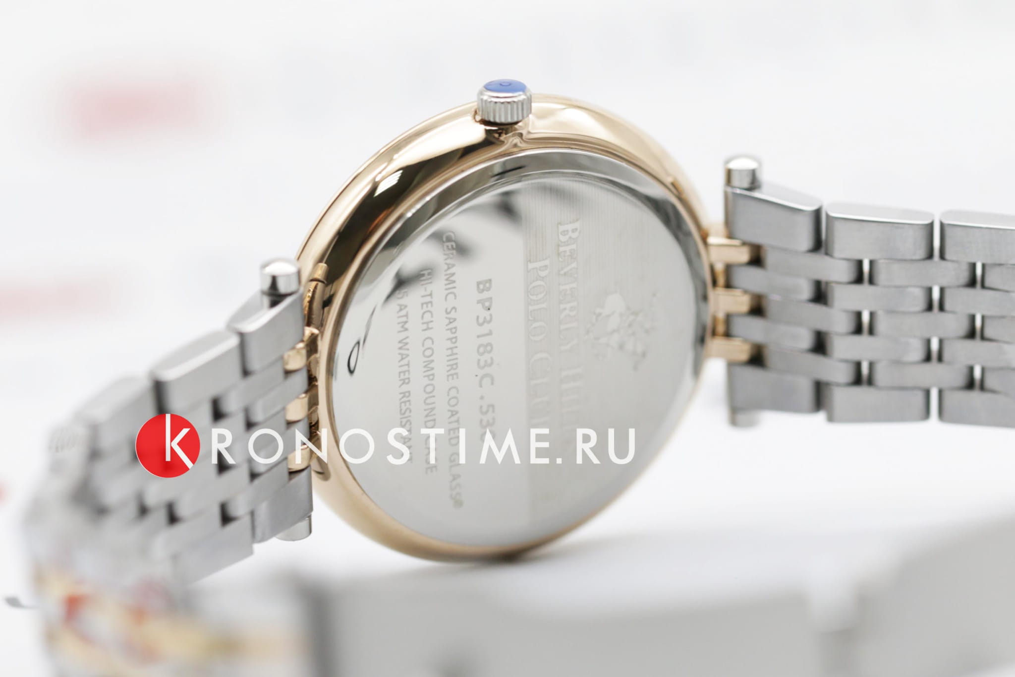 Американские женские часы с минеральным стекломМинеральное стеклоМинеральное стекло представляет собой искусственно выращенный минерал кварца. Такое стекло отличается особой устойчивостью к повреждениям и царапинам. Уступает по некоторым качествам сапфировому стеклу. Beverly Hills Polo Club BP3183C.530, с кварцевым механизмом с высокой точностью. Класс водозащиты: 50 метров, позволит защитить корпус от случайных брызг или капель дождя. БезельБезельВнешний ободок, закрепляющий стекло. В спортивных часах так называется поворотное кольцо с делениями на циферблате, выполняет роль таймера – замеряет отрезки времени на шкале. Неподвижный безель – элемент декора. Однонаправленно вращающийся безель на дайверских часах позволяет фиксировать моменты погружения и выныривания на поверхность. украшен кристаллами. Бриллиант в позиции 6 часов. Корпус часов изготовлен из суперметалла с IP-покрытиемIP-покрытиеМетод ионного напыления. Демонстрирует повышенную устойчивость к истиранию, окислению и химическим веществам. Под воздействием высокого давления и температуры около 1500°C молекулы металла надёжно соединяются с частицами корпуса часов.. Раскладная застёжкаРаскладная застёжкаТакой тип застёжки используется только на браслетах из металла. Она никогда не раскрывается полностью, происходит разделение на 2 и более частей. Раскладывающая застёжка снизит вероятность потери часов к минимуму..