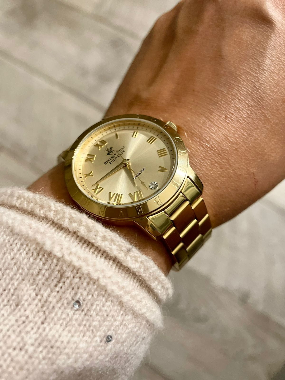 Американские женские часы с минеральным стекломМинеральное стеклоМинеральное стекло представляет собой искусственно выращенный минерал кварца. Такое стекло отличается особой устойчивостью к повреждениям и царапинам. Уступает по некоторым качествам сапфировому стеклу. Beverly Hills Polo Club BP3386C.110, кварцевый механизм с высокой точностью. Корпус и браслет часов изготовлены из нержавеющей стали с IP-покрытиемIP-покрытиеМетод ионного напыления. Демонстрирует повышенную устойчивость к истиранию, окислению и химическим веществам. Под воздействием высокого давления и температуры около 1500°C молекулы металла надёжно соединяются с частицами корпуса часов..На неподвижном безелеБезельВнешний ободок, закрепляющий стекло. В спортивных часах так называется поворотное кольцо с делениями на циферблате, выполняет роль таймера – замеряет отрезки времени на шкале. Неподвижный безель – элемент декора. Однонаправленно вращающийся безель на дайверских часах позволяет фиксировать моменты погружения и выныривания на поверхность. из нержавеющей стали с IP-покрытиемIP-покрытиеМетод ионного напыления. Демонстрирует повышенную устойчивость к истиранию, окислению и химическим веществам. Под воздействием высокого давления и температуры около 1500°C молекулы металла надёжно соединяются с частицами корпуса часов. указано название бренда. Циферблат украшен кристаллом. Класс водозащиты: 50 метров, позволит защитить корпус от случайных брызг или капель дождя. Стальной браслет на раскладной застёжкеРаскладная застёжкаТакой тип застёжки используется только на браслетах из металла. Она никогда не раскрывается полностью, происходит разделение на 2 и более частей. Раскладывающая застёжка снизит вероятность потери часов к минимуму..