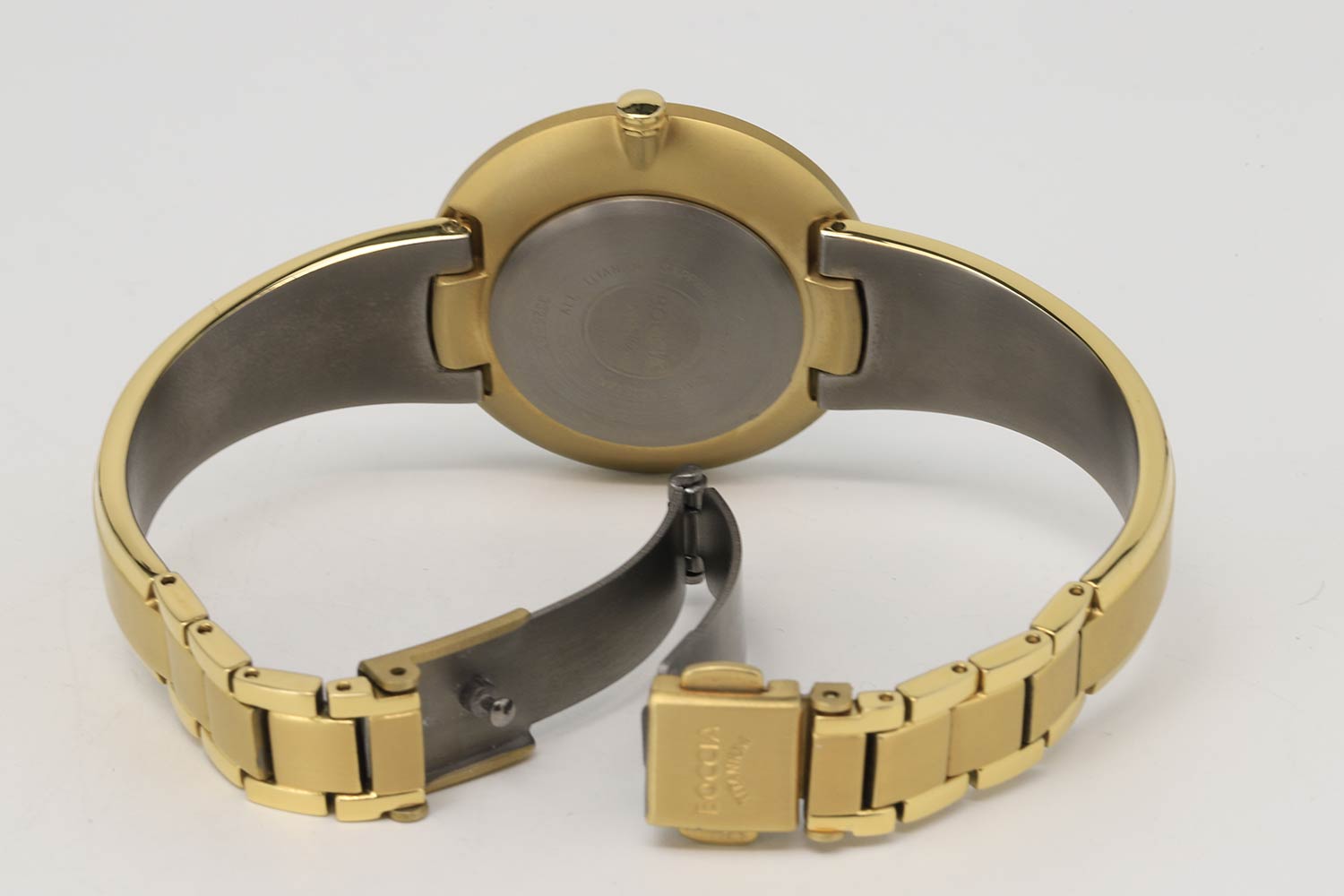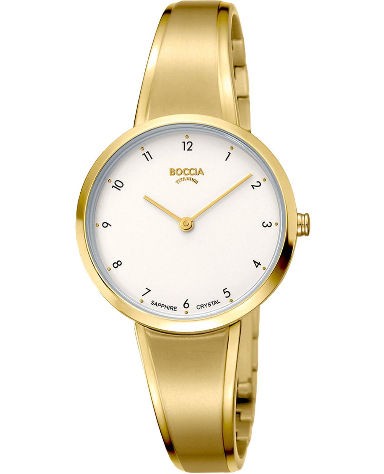 Женские немецкие наручные часы Boccia Titanium 3325-03 с надёжным кварцевым механизмом. Корпус и браслет часов изготовлены из титана с PVD-покрытиемPVDУльтратонкое покрытие наносится в технике вакуумного напыления, сочетает в себе нитрид титана особой прочности со слоем золота или оксида хрома. Несёт в себе декоративную или защитную функцию.. Сапфировое стеклоСапфировое стеклоПрочный и надёжный материал из кристалла сапфира синтетического происхождения, характеризующийся особой твёрдостью и устойчивостью к царапинам и повреждениям. устойчивое к мелким механическим повреждениям. Класс водозащиты: 30 метров, позволит защитить корпус от случайных брызг или капель дождя. Титановый браслет на раскладной застёжкеРаскладная застёжкаТакой тип застёжки используется только на браслетах из металла. Она никогда не раскрывается полностью, происходит разделение на 2 и более частей. Раскладывающая застёжка снизит вероятность потери часов к минимуму..