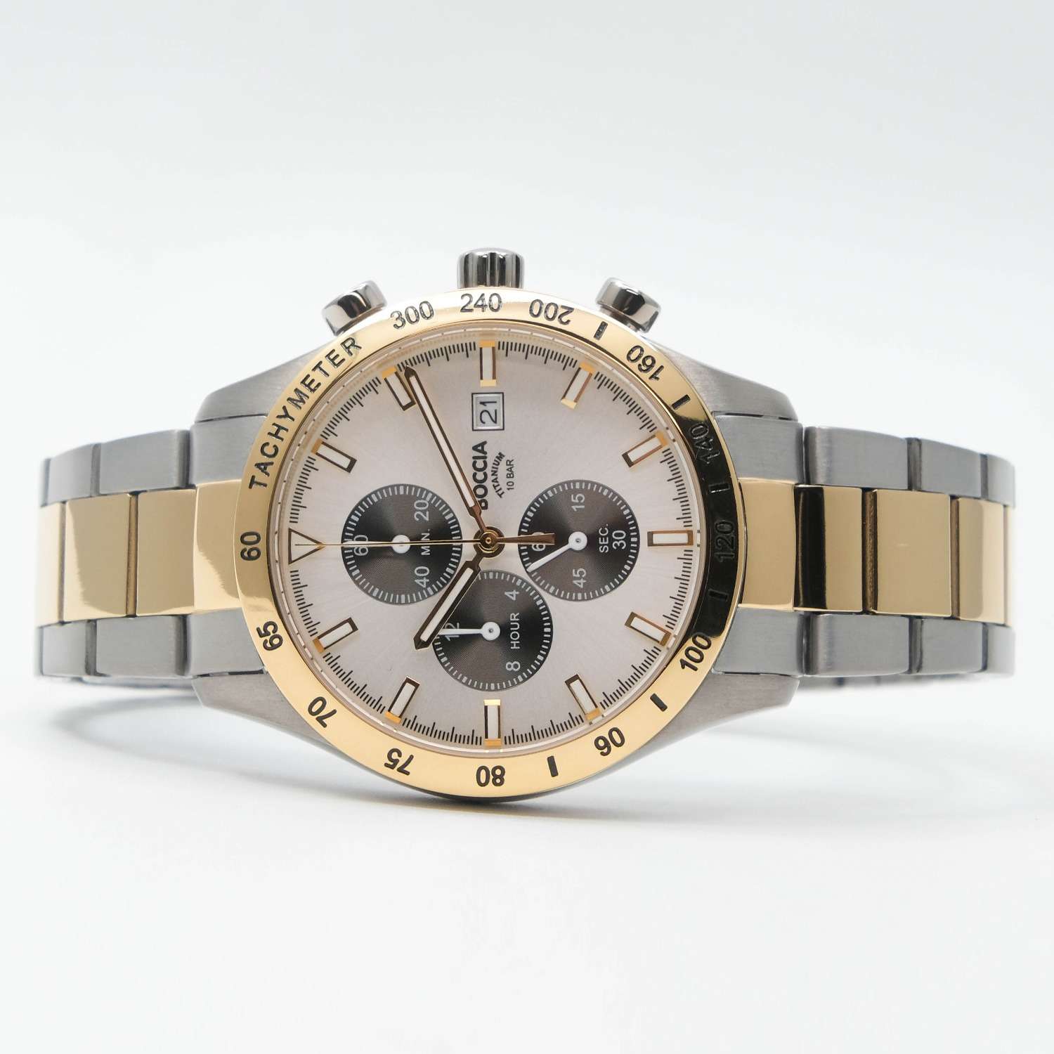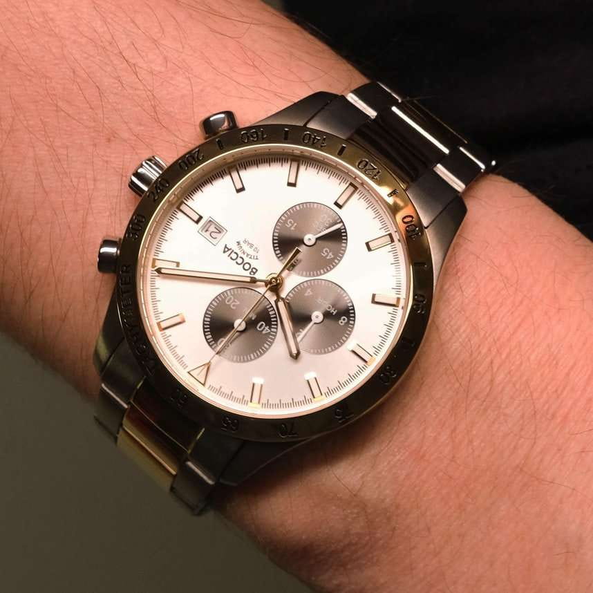 Часы Boccia 3739-04 представляют собой идеальное сочетание стиля и функциональности для современного мужчины. Этот хронографХронографФункция позволяет измерять отрезки времени с особой точностью: часы, минуты, секунды. Верным признаком хронографа является наличие на циферблате 3 дополнительных окошек-счётчиков. оснащен надежным кварцевым механизмом Miyota 0S10, они обеспечивают высокую точность хода. Основное внимание в дизайне уделяется центральным часовой и минутной стрелкам, в то время как изящная секундная стрелка вынесена на малый циферблат, добавляя нотку утонченной асимметрии. На отметке 3 часов расположена аккуратная апертура даты, обеспечивающая удобство и практичность в повседневной жизни. Функция секундомераСекундомерСекундоме́р — прибор, способный измерять интервалы времени с точностью до долей секунды. и тахиметрическаяТахиметрРазмеченная шкала, располагается на ободке или безеле часов. Тахиметр позволяет рассчитать скорость на определённом участке пути, расстояние измеряется в километрах или милях. шкала предоставляют дополнительные возможности для активных и динамичных людей, ценящих не только стиль, но и функциональность. Серебристый циферблат излучает спокойствие и гармонию, заключенный в круглый корпус из суперлегкого титана. Это не только придает часам современный вид, но и обеспечивает невероятный комфорт на запястье. Часы дополнены титановым безелемБезельВнешний ободок, закрепляющий стекло. В спортивных часах так называется поворотное кольцо с делениями на циферблате, выполняет роль таймера – замеряет отрезки времени на шкале. Неподвижный безель – элемент декора. Однонаправленно вращающийся безель на дайверских часах позволяет фиксировать моменты погружения и выныривания на поверхность. с PVDPVDУльтратонкое покрытие наносится в технике вакуумного напыления, сочетает в себе нитрид титана особой прочности со слоем золота или оксида хрома. Несёт в себе декоративную или защитную функцию.-покрытием цвета желтого золота. Стрелки и метки часов покрыты люминесцентным покрытиемЛюминесцентное покрытиеПозволяет считывать показания времени в темноте. Производители наносят на стрелки, часовые индексы, безель или поверхность циферблата светонакопительный состав, дающий холодное свечение., которое мягко светится в темноте, освещая путь даже в самых загадочных сумерках. Титановый браслет с PVDPVDУльтратонкое покрытие наносится в технике вакуумного напыления, сочетает в себе нитрид титана особой прочности со слоем золота или оксида хрома. Несёт в себе декоративную или защитную функцию.-покрытием и раскладной застёжкойРаскладная застёжкаТакой тип застёжки используется только на браслетах из металла. Она никогда не раскрывается полностью, происходит разделение на 2 и более частей. Раскладывающая застёжка снизит вероятность потери часов к минимуму. добавляет элегантности и обеспечивает надежную фиксацию на руке. Часы защищены прочным минеральным стекломМинеральное стеклоМинеральное стекло представляет собой искусственно выращенный минерал кварца. Такое стекло отличается особой устойчивостью к повреждениям и царапинам. Уступает по некоторым качествам сапфировому стеклу., устойчивым к мелким механическим повреждениям, что сохраняет их безупречный вид при повседневном использовании. Водо