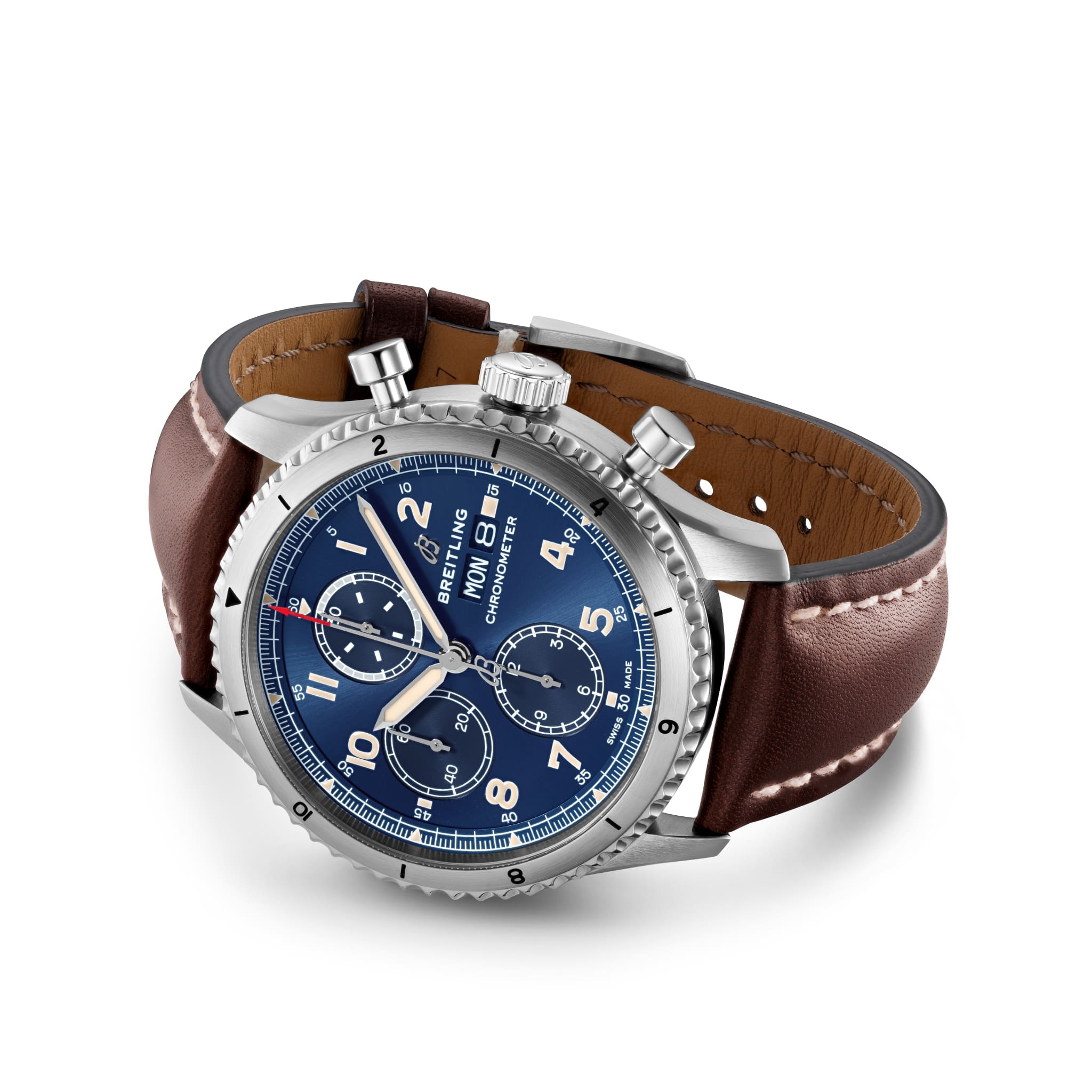 Модель Aviator 8 Chronograph 43 оснащена 30-минутным и 12-часовым счетчиками, расположенными в положении «12» и «6 часов», а также малой секундной стрелкой в положении «9 часов». Уровень точности достигает 1/4 секунды.