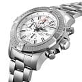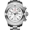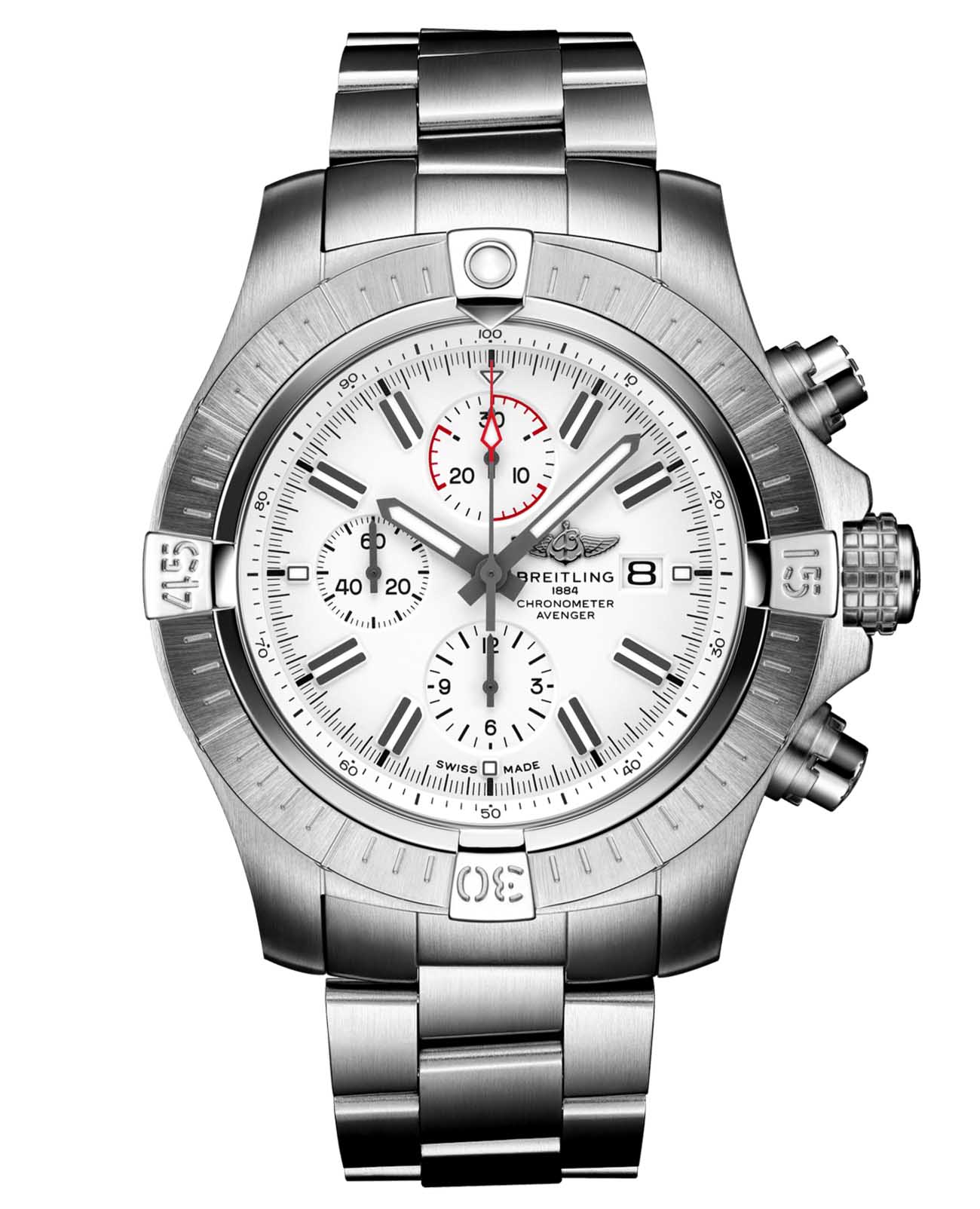 Смелый, чрезвычайно прочный и ударопрочный хронографХронографФункция позволяет измерять отрезки времени с особой точностью: часы, минуты, секунды. Верным признаком хронографа является наличие на циферблате 3 дополнительных окошек-счётчиков. Super Avenger Chronograph 48 делает громкое заявление ”я здесь". Как настоящий Breitling Avenger, его можно использовать в перчатках и он обеспечивает непревзойденную безопасность и надежность любому воздушному искателю приключений. Этот хронографХронографФункция позволяет измерять отрезки времени с особой точностью: часы, минуты, секунды. Верным признаком хронографа является наличие на циферблате 3 дополнительных окошек-счётчиков. Super Avenger 48, выпущенный ограниченным тиражом в 1000 экземпляров, оснащен прочным корпусом из нержавеющей стали диаметром 48 мм, уникальным белым циферблатом и браслетом из нержавеющей стали на выбор или черным ремешком из кожи военного образца с пряжкой из нержавеющей стали или раскладной застёжкойРаскладная застёжкаТакой тип застёжки используется только на браслетах из металла. Она никогда не раскрывается полностью, происходит разделение на 2 и более частей. Раскладывающая застёжка снизит вероятность потери часов к минимуму.. Благодаря прочному безелюБезельВнешний ободок, закрепляющий стекло. В спортивных часах так называется поворотное кольцо с делениями на циферблате, выполняет роль таймера – замеряет отрезки времени на шкале. Неподвижный безель – элемент декора. Однонаправленно вращающийся безель на дайверских часах позволяет фиксировать моменты погружения и выныривания на поверхность. и специальному рисунку захвата заводной головки и кнопок хронографаХронографФункция позволяет измерять отрезки времени с особой точностью: часы, минуты, секунды. Верным признаком хронографа является наличие на циферблате 3 дополнительных окошек-счётчиков. Super Avenger Chronograph 48 можно легко использовать в перчатках.