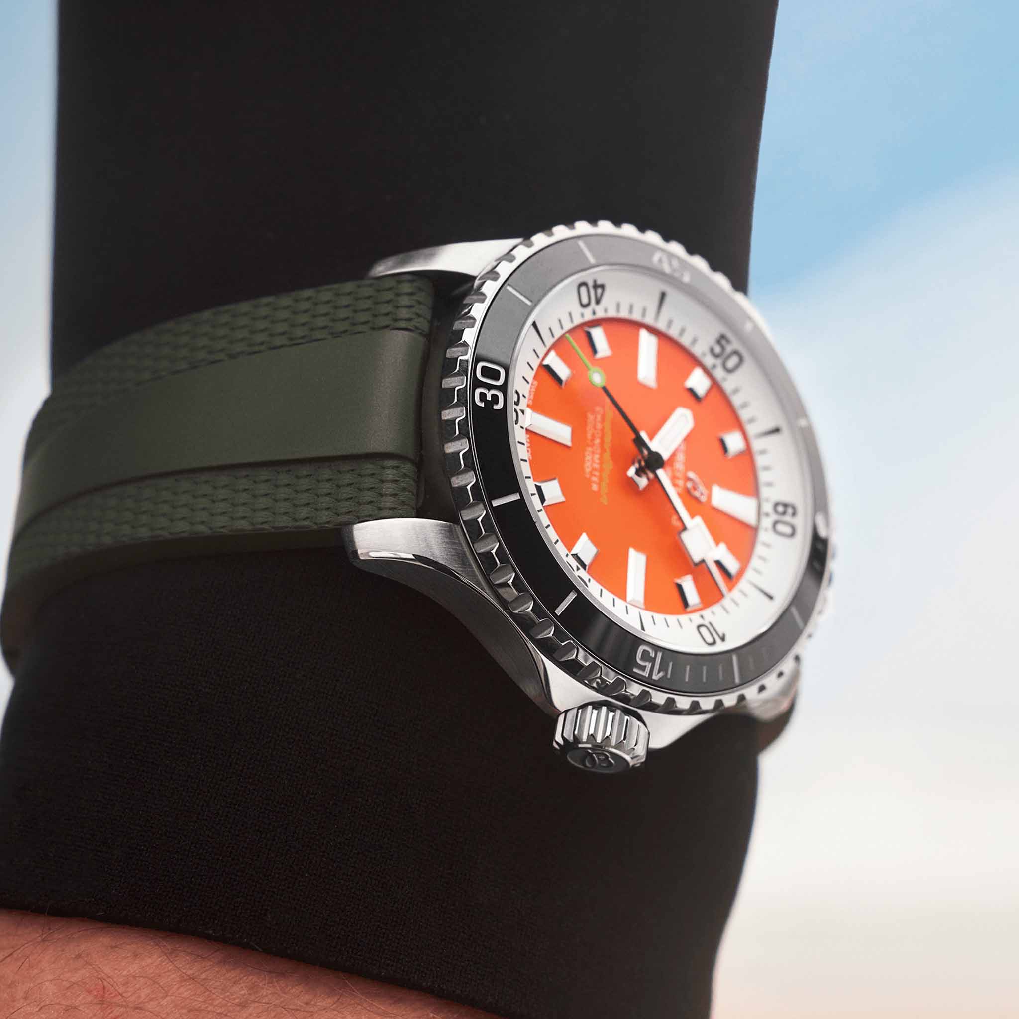 Мужские водонепроницаемые швейцарские часы Breitling Superocean Automatic 42 Kelly Slater A173751A1O1S1, механический механизм (автоматический калибр) с высокой точностью. Сапфировое стеклоСапфировое стеклоПрочный и надёжный материал из кристалла сапфира синтетического происхождения, характеризующийся особой твёрдостью и устойчивостью к царапинам и повреждениям. устойчивое к появлению царапин, обладающее высокой прозрачностью. Класс водозащиты: 300 метров, позволит плавать, нырять и заниматься другими водными видами спорта. Корпус часов изготовлен из стали. Силиконовый ремешок с раскладной застёжкойРаскладная застёжкаТакой тип застёжки используется только на браслетах из металла. Она никогда не раскрывается полностью, происходит разделение на 2 и более частей. Раскладывающая застёжка снизит вероятность потери часов к минимуму.. Стрелки и метки с люминесцентным покрытиемЛюминесцентное покрытиеПозволяет считывать показания времени в темноте. Производители наносят на стрелки, часовые индексы, безель или поверхность циферблата светонакопительный состав, дающий холодное свечение.. Широкие стрелки и индексы с люминесцентным покрытиемЛюминесцентное покрытиеПозволяет считывать показания времени в темноте. Производители наносят на стрелки, часовые индексы, безель или поверхность циферблата светонакопительный состав, дающий холодное свечение. обеспечивают легкую читаемость под водой. Вращающийся стальной безельБезельВнешний ободок, закрепляющий стекло. В спортивных часах так называется поворотное кольцо с делениями на циферблате, выполняет роль таймера – замеряет отрезки времени на шкале. Неподвижный безель – элемент декора. Однонаправленно вращающийся безель на дайверских часах позволяет фиксировать моменты погружения и выныривания на поверхность. с люминесцентным покрытиемЛюминесцентное покрытиеПозволяет считывать показания времени в темноте. Производители наносят на стрелки, часовые индексы, безель или поверхность циферблата светонакопительный состав, дающий холодное свечение. Superluminova из нержавеющей стали и керамики, защищенный от царапин, никогда не изнашивается и не выцветает.