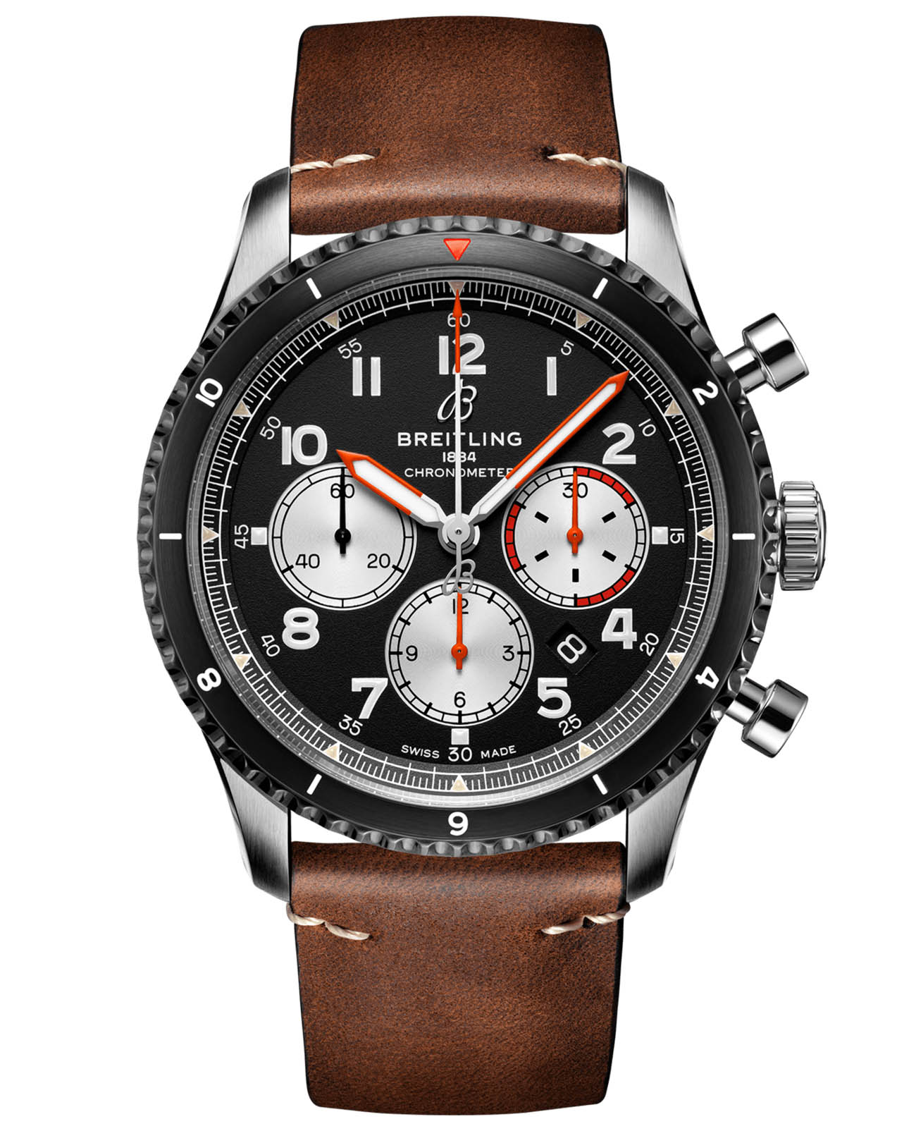 Характерной особенностью циферблата черного цвета являются белые цифры и серебристые счетчики хронографаХронографФункция позволяет измерять отрезки времени с особой точностью: часы, минуты, секунды. Верным признаком хронографа является наличие на циферблате 3 дополнительных окошек-счётчиков.. Динамичные красно-оранжевые акценты напоминают опознавательные знаки на фюзеляже самолетов de Havilland Mosquito и подчеркивают уникальный характер модели. Бомбардировщик de Havilland Mosquito сыграл важную роль в истории авиации. И именно поэтому компания Breitling посвящает этой мировой легенде новую модель – Aviator 8 B01 Chronograph 43 Mosquito.