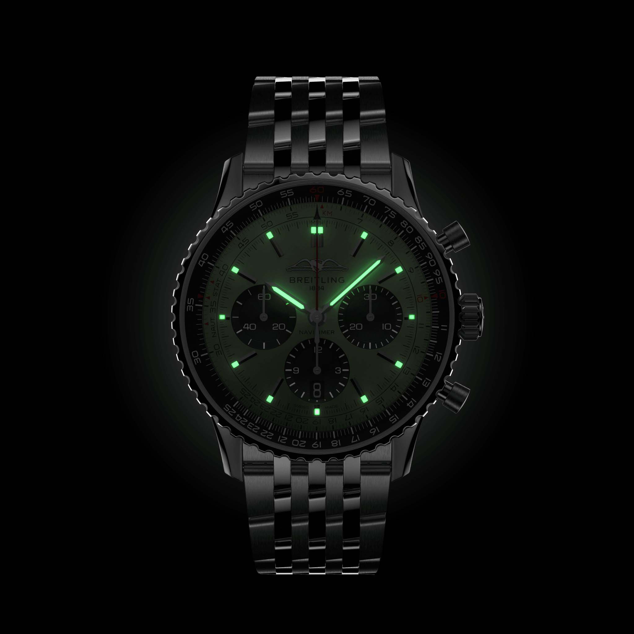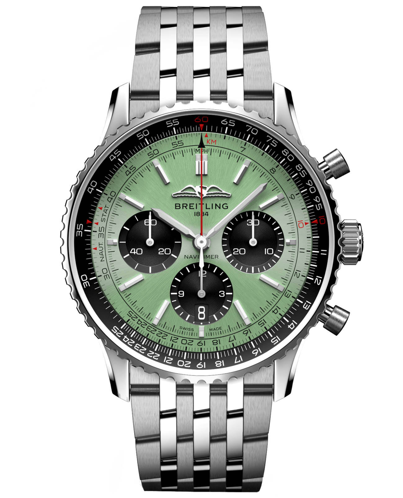 Мужские швейцарские часы-хронографХронографФункция позволяет измерять отрезки времени с особой точностью: часы, минуты, секунды. Верным признаком хронографа является наличие на циферблате 3 дополнительных окошек-счётчиков. с секундомеромСекундомерСекундоме́р — прибор, способный измерять интервалы времени с точностью до долей секунды. Breitling Navitimer B01 Chronograph 43 AB0138241L1A1, механический механизм (автоматический калибр) с высокой точностью. Сапфировое стеклоСапфировое стеклоПрочный и надёжный материал из кристалла сапфира синтетического происхождения, характеризующийся особой твёрдостью и устойчивостью к царапинам и повреждениям. с антибликовым покрытием устойчивое к появлению царапин, обладающее высокой прозрачностью. Класс водозащиты: 30 метров, позволит защитить корпус от случайных брызг или капель дождя. Корпус часов изготовлен из стали. Шкала тахиметраТахиметрРазмеченная шкала, располагается на ободке или безеле часов. Тахиметр позволяет рассчитать скорость на определённом участке пути, расстояние измеряется в километрах или милях. на циферблате. Часы имеют сертификат COSCСертификат COSCОфициальный сертификат, подтверждающий то, что часы ходят с особо высокой точностью. Для получения документа часы подвергаются тестовым испытаниям, разработанным швейцарским институтом тестирования хронометров COSC. Допустимая норма для механических часов -4/+6 секунд в день, для кварцевых моделей +/- 0,07 секунд в день.. Окошко даты находится в положении 6 часов. Стрелки и метки с люминесцентным покрытиемЛюминесцентное покрытиеПозволяет считывать показания времени в темноте. Производители наносят на стрелки, часовые индексы, безель или поверхность циферблата светонакопительный состав, дающий холодное свечение.. Стальной браслет с застёжкой-бабочкой с кнопкамиЗастёжка "бабочка"Такой вид застёжки дополняется предохранителями, помогающими избежать случайного раскрытия браслета. Обладают изящным исполнением. .