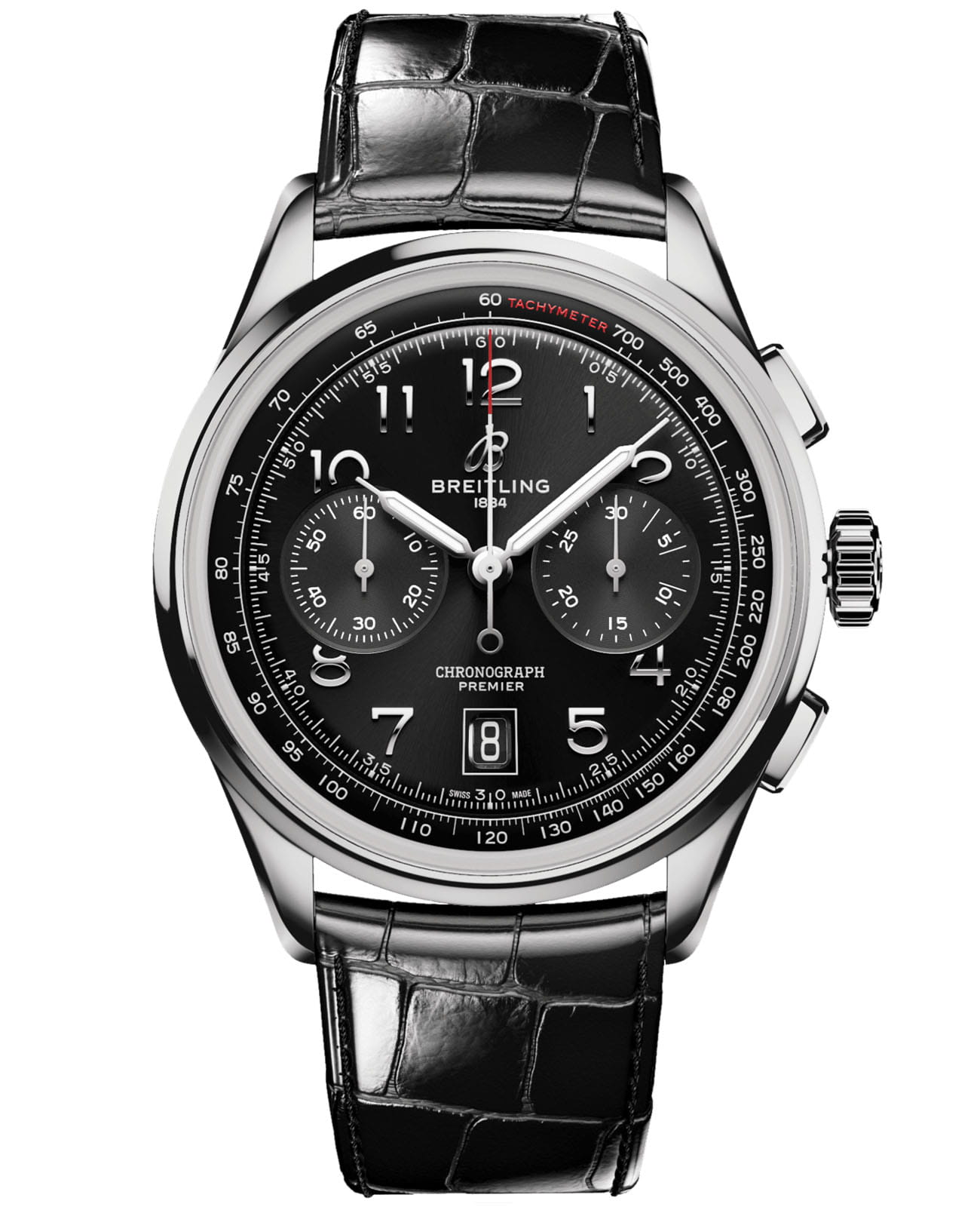 Мужские швейцарские часы-хронографХронографФункция позволяет измерять отрезки времени с особой точностью: часы, минуты, секунды. Верным признаком хронографа является наличие на циферблате 3 дополнительных окошек-счётчиков. с тахиметромТахиметрРазмеченная шкала, располагается на ободке или безеле часов. Тахиметр позволяет рассчитать скорость на определённом участке пути, расстояние измеряется в километрах или милях. Breitling Premier B01 Chronograph 42 AB0145221B1P1, механический механизм (автоматический калибр) с высокой точностью. Сапфировое стеклоСапфировое стеклоПрочный и надёжный материал из кристалла сапфира синтетического происхождения, характеризующийся особой твёрдостью и устойчивостью к царапинам и повреждениям. с антибликовым покрытием устойчивое к появлению царапин, обладающее высокой прозрачностью. Класс водозащиты: 100 метров, позволит плавать, нырять и заниматься другими водными видами спорта. Корпус часов изготовлен из стали. Кожаный крокодиловый ремешок с раскладной застёжкойРаскладная застёжкаТакой тип застёжки используется только на браслетах из металла. Она никогда не раскрывается полностью, происходит разделение на 2 и более частей. Раскладывающая застёжка снизит вероятность потери часов к минимуму.. Стрелки с люминесцентным покрытиемЛюминесцентное покрытиеПозволяет считывать показания времени в темноте. Производители наносят на стрелки, часовые индексы, безель или поверхность циферблата светонакопительный состав, дающий холодное свечение.. Окошко даты находится в положении 6 часов. СекундомерСекундомерСекундоме́р — прибор, способный измерять интервалы времени с точностью до долей секунды..