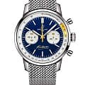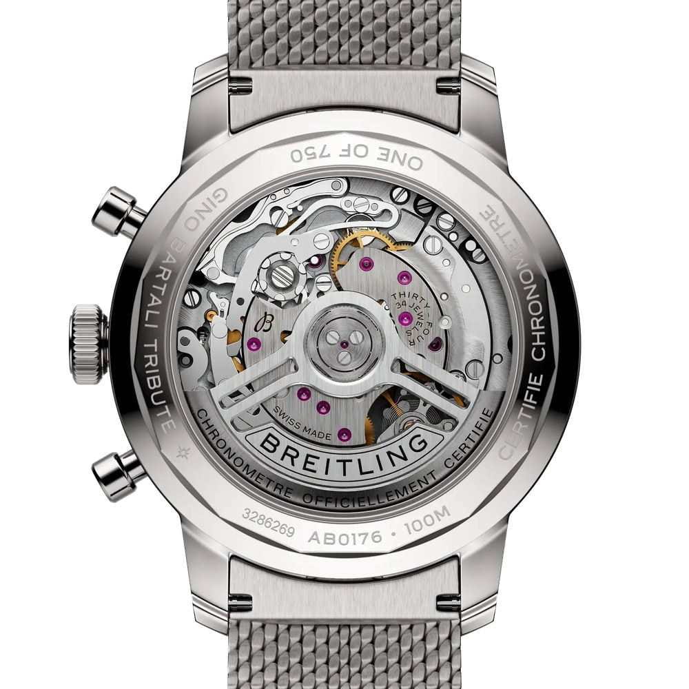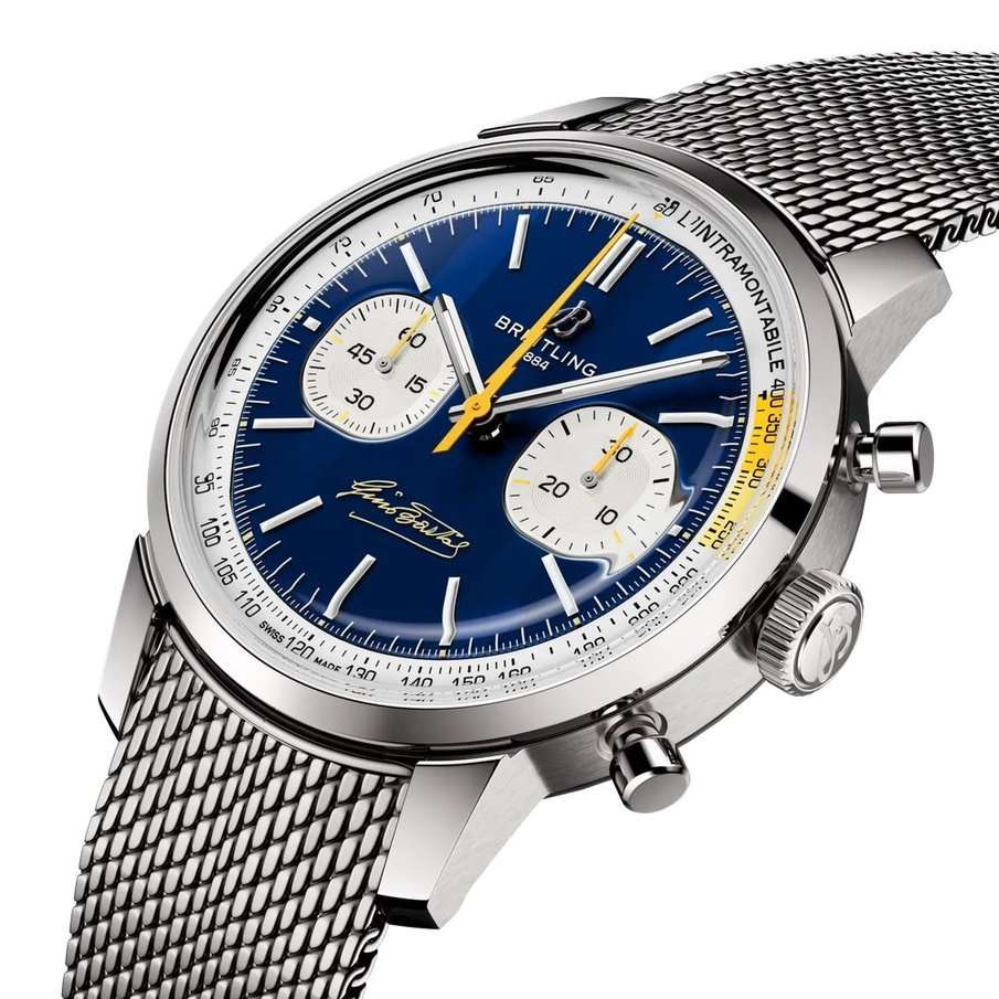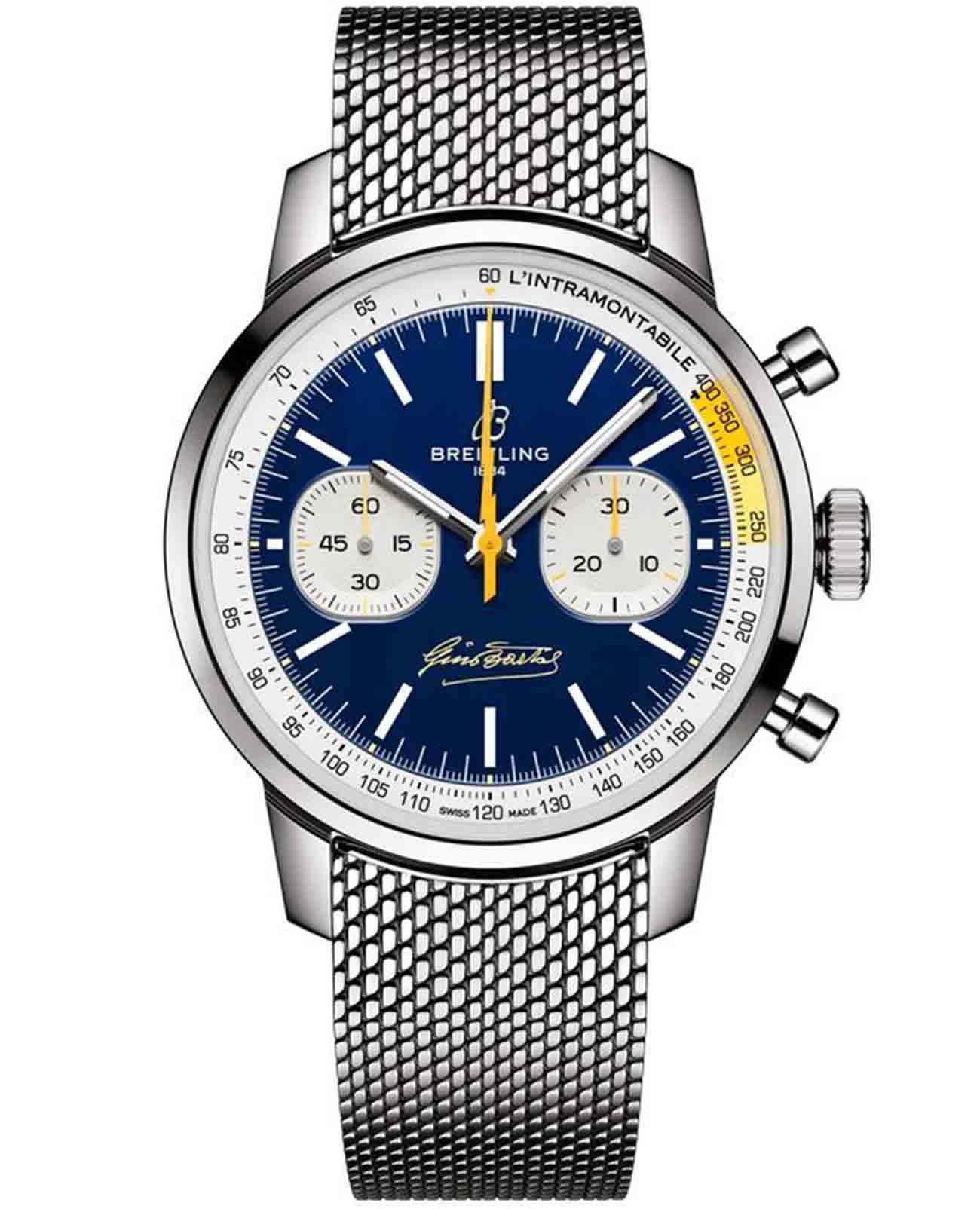 Breitling Top Time B01 Gino Bartali AB01767A1C1A1— лимитированная модель, объединяющая дух велоспорта, винтажный стиль и высокоточную механику. Корпус диаметром 41 мм выполнен из нержавеющей стали с полированной отделкой. Прозрачная задняя крышка украшена гравировкой «Gino Bartali Tribute» и пометкой «One of 750», подчёркивающей эксклюзивность выпуска. Циферблат защищён сапфировым стекломСапфировое стеклоПрочный и надёжный материал из кристалла сапфира синтетического происхождения, характеризующийся особой твёрдостью и устойчивостью к царапинам и повреждениям. с антибликовым покрытиемАнтибликовое покрытиеСлой оксида металла в 0,13-0,3 микрон, благодаря которому стекло часов не бликует и не отражает свет. Антибликовое покрытие уменьшает отражение света в 10 раз, обеспечивая отличную читаемость показателей циферблата.. Синий матовый циферблат выполнен в стиле би-компакс с двумя белыми субциферблатами. На внешней шкале расположена надпись «L'Intramontabile», а на отметке «6 часов» — подпись Джино Бартали. Внутри установлен автоматический швейцарский хронографХронографФункция позволяет измерять отрезки времени с особой точностью: часы, минуты, секунды. Верным признаком хронографа является наличие на циферблате 3 дополнительных окошек-счётчиков. калибра Breitling B01 без даты, с запасом хода до 70 часов. Механизм сертифицирован по стандарту COSCСертификат COSCОфициальный сертификат, подтверждающий то, что часы ходят с особо высокой точностью. Для получения документа часы подвергаются тестовым испытаниям, разработанным швейцарским институтом тестирования хронометров COSC. Допустимая норма для механических часов -4/+6 секунд в день, для кварцевых моделей +/- 0,07 секунд в день., что гарантирует высокую точность. Модель комплектуется браслетом миланского плетения на застёжке «бабочка» с кнопкамиЗастёжка "бабочка"Такой вид застёжки дополняется предохранителями, помогающими избежать случайного раскрытия браслета. Обладают изящным исполнением. , обеспечивающей надёжную и комфортную посадку. Водонепроницаемость 100 метров делает часы надёжными спутниками в активной жизни. Идеальный выбор для тех, кто ценит историческое наследие, эстетику 60-х и современное исполнение.