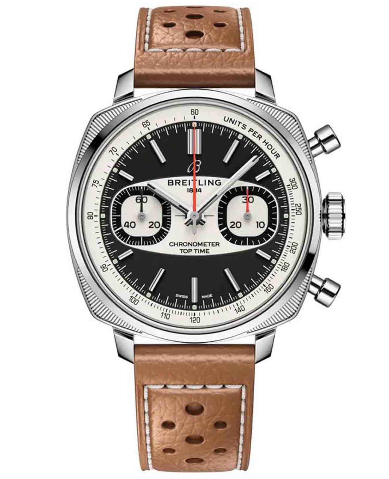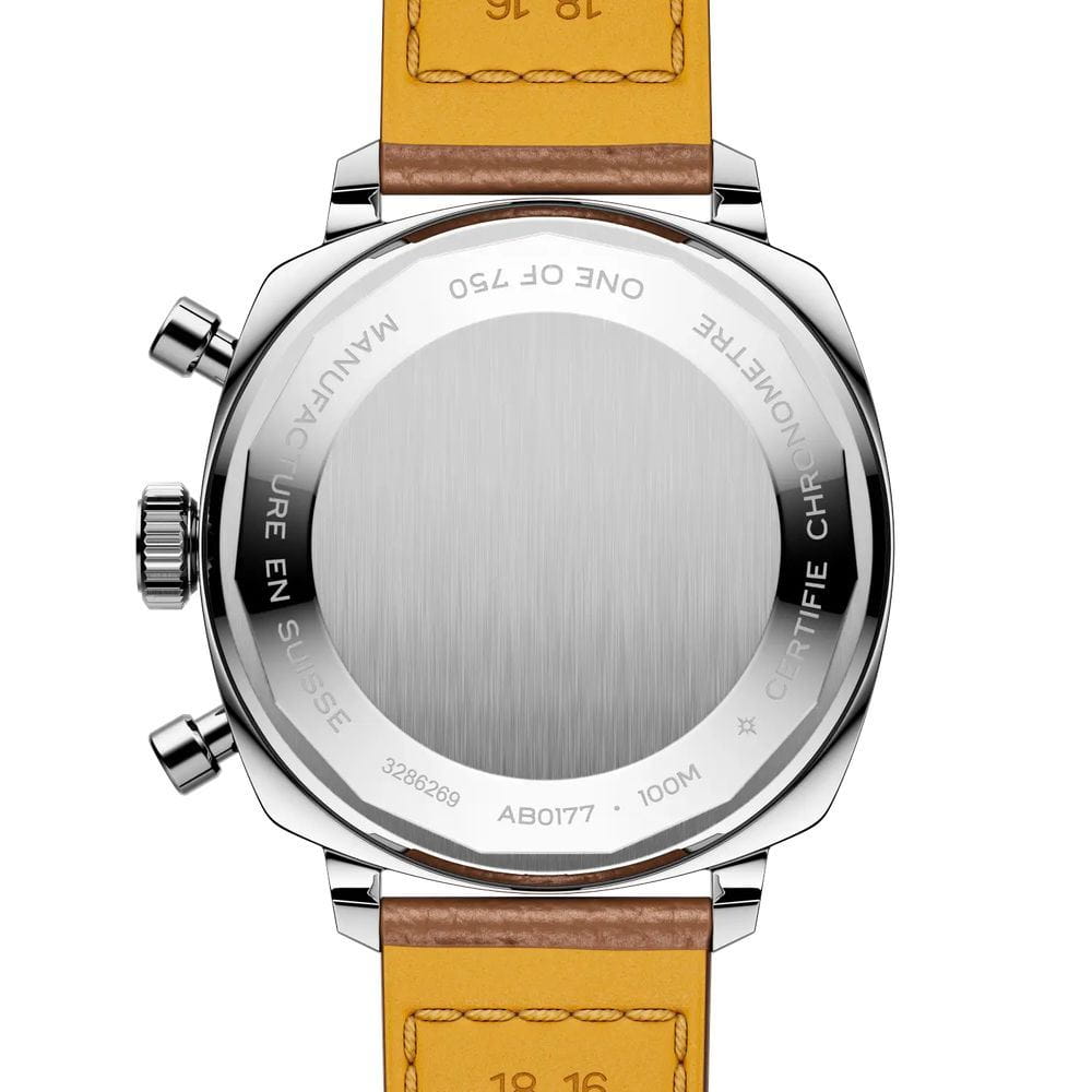 Breitling Top Time B01 Racing AB01771A1B1X1 — лимитированная модель, сочетающая винтажную эстетику и современные технологии, вдохновлённая гоночными хронографами 1960-х годов. Корпус диаметром 38 мм выполнен из нержавеющей стали с полированной отделкой. На задней крышке — гравировка «One of 750», указывающая на ограниченный тираж. Циферблат защищён сапфировым стекломСапфировое стеклоПрочный и надёжный материал из кристалла сапфира синтетического происхождения, характеризующийся особой твёрдостью и устойчивостью к царапинам и повреждениям. с антибликовым покрытиемАнтибликовое покрытиеСлой оксида металла в 0,13-0,3 микрон, благодаря которому стекло часов не бликует и не отражает свет. Антибликовое покрытие уменьшает отражение света в 10 раз, обеспечивая отличную читаемость показателей циферблата., устойчивым к царапинам и бликам. Циферблат оформлен в характерном стиле «surfboard». Разметка и стрелки покрыты люминесцентным покрытиемЛюминесцентное покрытиеПозволяет считывать показания времени в темноте. Производители наносят на стрелки, часовые индексы, безель или поверхность циферблата светонакопительный состав, дающий холодное свечение. для хорошей читаемости в темноте. Модель оснащена автоматическим хронографомХронографФункция позволяет измерять отрезки времени с особой точностью: часы, минуты, секунды. Верным признаком хронографа является наличие на циферблате 3 дополнительных окошек-счётчиков. калибра Breitling B01 с 1/4-секундной точностью, 30-минутным счётчиком, запасом хода до 70 часов и сертификацией COSCСертификат COSCОфициальный сертификат, подтверждающий то, что часы ходят с особо высокой точностью. Для получения документа часы подвергаются тестовым испытаниям, разработанным швейцарским институтом тестирования хронометров COSC. Допустимая норма для механических часов -4/+6 секунд в день, для кварцевых моделей +/- 0,07 секунд в день.. Часы укомплектованы перфорированным кожаным ремешком на стандартной застежке, которая обеспечивает комфорт и надёжную фиксацию. Водонепроницаемость 100 метров делает модель подходящей для активного образа жизни и повседневной эксплуатации. Top Time B01 Racing — яркое переосмысление классического хронографа для поклонников винтажного стиля и швейцарской точности.