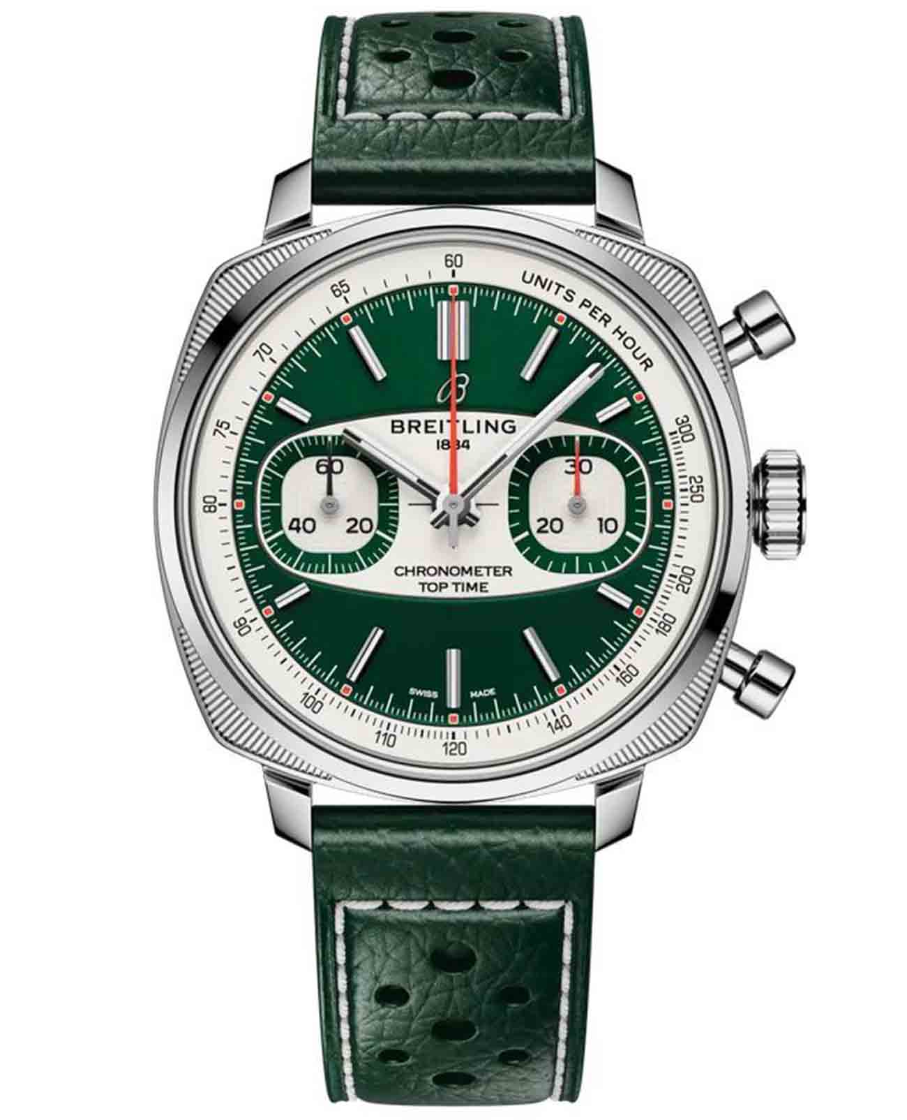 Breitling Top Time B01 Racing Green AB01771A1L1X1 — лимитированная модель, сочетающая винтажную эстетику и современные технологии, вдохновлённая гоночными хронографами 1960-х годов. Корпус диаметром 38 мм выполнен из нержавеющей стали с полированной отделкой. На задней крышке — гравировка «One of 750», указывающая на ограниченный тираж. Циферблат защищён сапфировым стекломСапфировое стеклоПрочный и надёжный материал из кристалла сапфира синтетического происхождения, характеризующийся особой твёрдостью и устойчивостью к царапинам и повреждениям. с антибликовым покрытиемАнтибликовое покрытиеСлой оксида металла в 0,13-0,3 микрон, благодаря которому стекло часов не бликует и не отражает свет. Антибликовое покрытие уменьшает отражение света в 10 раз, обеспечивая отличную читаемость показателей циферблата., устойчивым к царапинам и бликам. Зелёный циферблат оформлен в характерном стиле «surfboard» с двумя белыми субциферблатами. Разметка и стрелки покрыты люминесцентным покрытиемЛюминесцентное покрытиеПозволяет считывать показания времени в темноте. Производители наносят на стрелки, часовые индексы, безель или поверхность циферблата светонакопительный состав, дающий холодное свечение. для хорошей читаемости в темноте. Модель оснащена автоматическим хронографомХронографФункция позволяет измерять отрезки времени с особой точностью: часы, минуты, секунды. Верным признаком хронографа является наличие на циферблате 3 дополнительных окошек-счётчиков. калибра Breitling B01 с 1/4-секундной точностью, 30-минутным счётчиком, запасом хода до 70 часов и сертификацией COSCСертификат COSCОфициальный сертификат, подтверждающий то, что часы ходят с особо высокой точностью. Для получения документа часы подвергаются тестовым испытаниям, разработанным швейцарским институтом тестирования хронометров COSC. Допустимая норма для механических часов -4/+6 секунд в день, для кварцевых моделей +/- 0,07 секунд в день.. Часы укомплектованы перфорированным зелёным кожаным ремешком на стандартной застежке, которая обеспечивает комфорт и надёжную фиксацию. Водонепроницаемость 100 метров делает модель подходящей для активного образа жизни и повседневной эксплуатации. Top Time B01 Racing Green — яркое переосмысление классического хронографа для поклонников винтажного стиля и швейцарской точности.