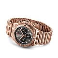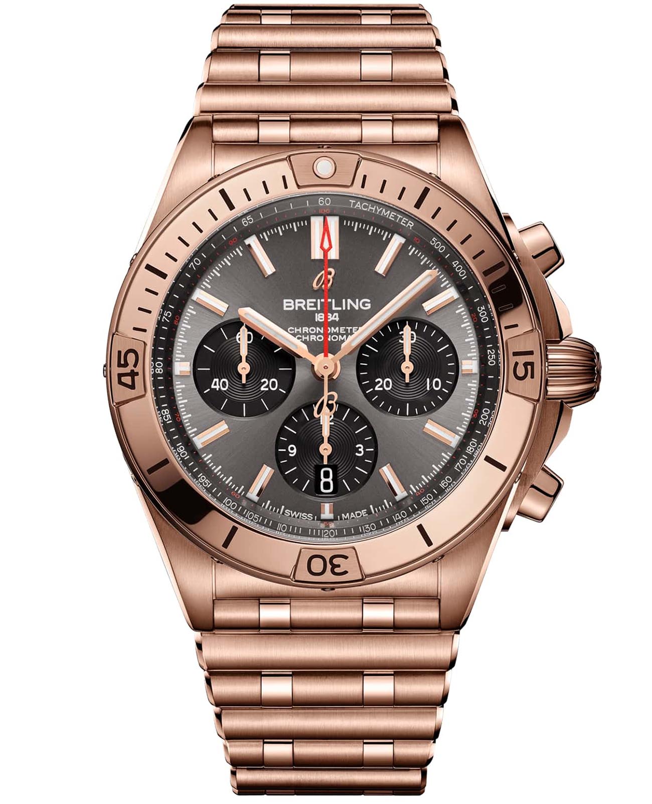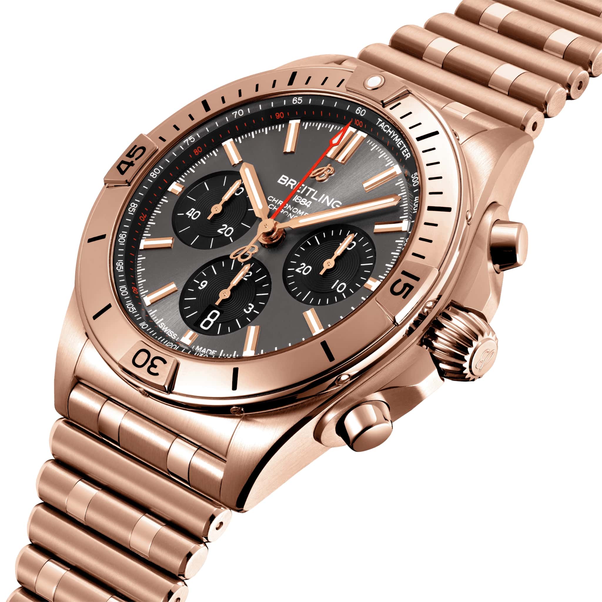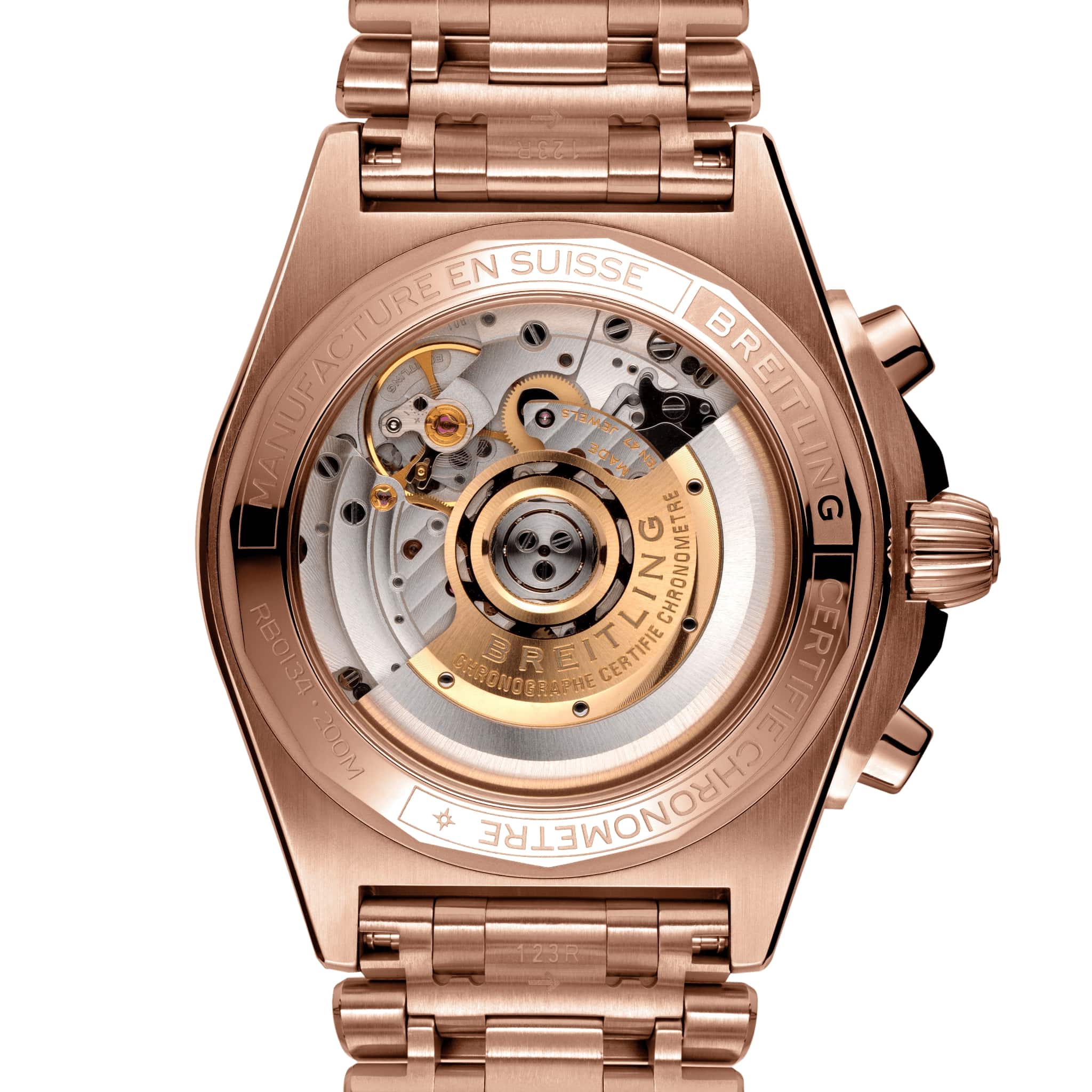 , что придаёт часам роскошный и утончённый внешний вид. Сапфировое стеклоСапфировое стеклоПрочный и надёжный материал из кристалла сапфира синтетического происхождения, характеризующийся особой твёрдостью и устойчивостью к царапинам и повреждениям. с антибликовым покрытием с обеих сторон защищает циферблат и обеспечивает превосходную читаемость. Антрацитовый циферблат с тремя чёрными счётчиками хронографа и накладными часовыми метками дополнен стрелками с люминесцентным покрытием Super-LumiNova®Люминесцентное покрытиеПозволяет считывать показания времени в темноте. Производители наносят на стрелки, часовые индексы, безель или поверхность циферблата светонакопительный состав, дающий холодное свечение., что обеспечивает отличную видимость даже в условиях низкой освещённости. Функции включают хронограф с 1/4-секундной стрелкой, 30-минутным и 12-часовым счётчиками, а также окошко даты между отметками «4» и «5» часов. Часы оснащены автоматическим калибром Breitling 01, сертифицированным COSCСертификат COSCОфициальный сертификат, подтверждающий то, что часы ходят с особо высокой точностью. Для получения документа часы подвергаются тестовым испытаниям, разработанным швейцарским институтом тестирования хронометров COSC. Допустимая норма для механических часов -4/+6 секунд в день, для кварцевых моделей +/- 0,07 секунд в день.. Механизм имеет частоту 28 800 полуколебаний в час, 47 камней и запас хода около 70 часов. Водозащита до 20 ATM (200 метров) делает их подходящими для плавания и дайвинга. Фирменный браслет «Rouleaux» из 18-каратного красного золота18-каратное золотоОбозначение по каратной системе пробирования, оно показывает, сколько драгоценного металла содержится в изделии. 18 карат - в составе 75% чистого золота, соответствует 750 пробе.