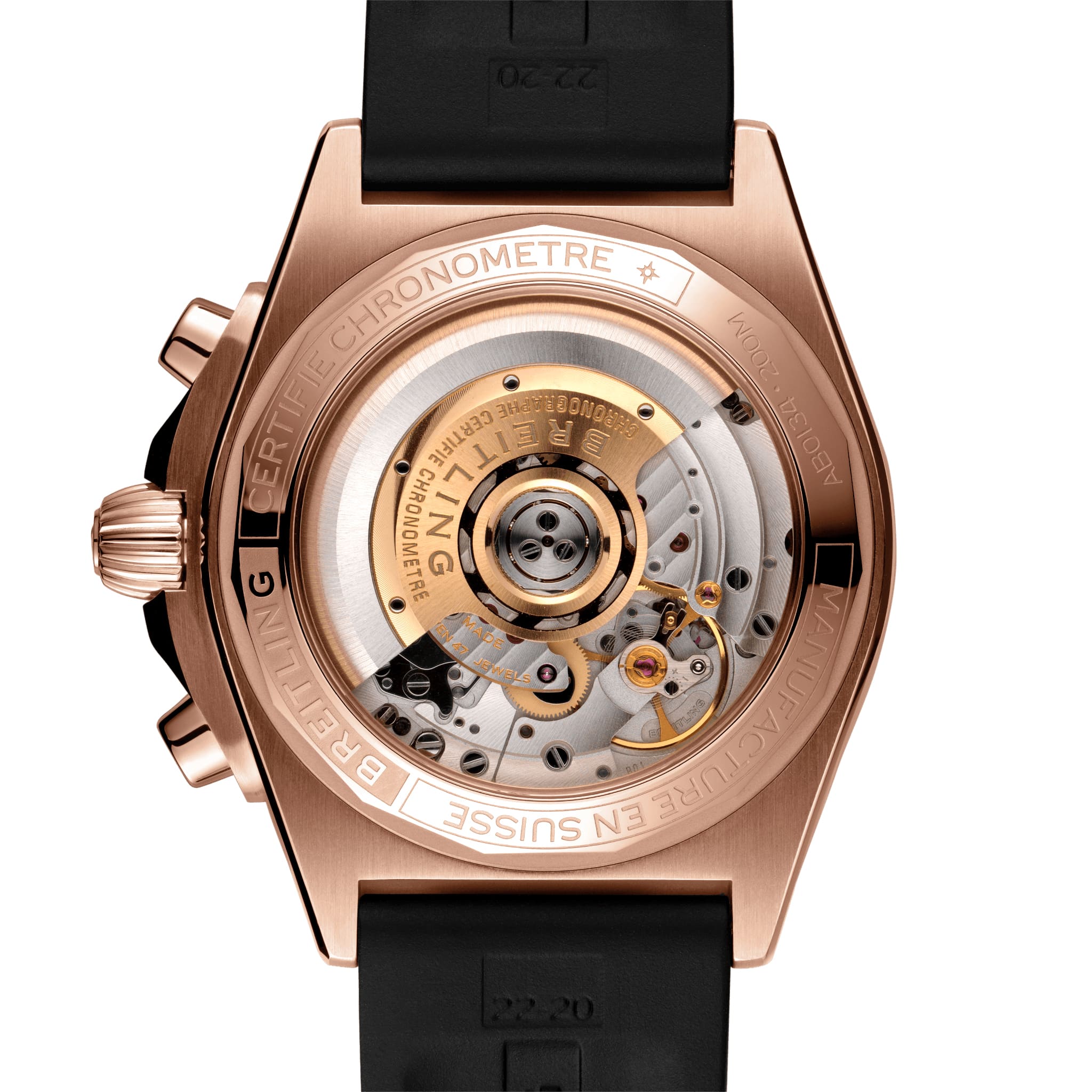 Отличительной особенностью модели является 42-миллиметровый корпус, оснащенный знаменитым безелем с четырьмя райдерами. Часы предлагаются в комплекте с черным каучуковым ремешком, подходящим к корпусу из 18-каратного розового золота и циферблату цвета антрацит. «Сердце» хронографа – мануфактурный калибр собственной разработки Breitling Manufacture Caliber 01, высокое качество которого подтверждено Швейцарским институтом официального тестирования хронометров (COSC).
