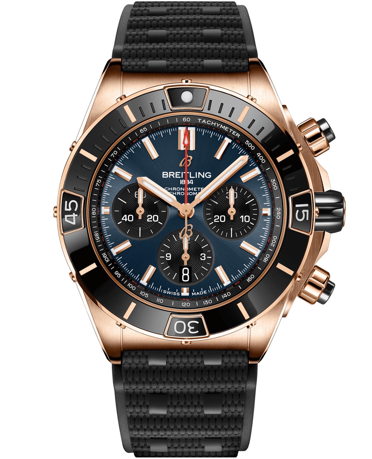 . Super Chronomat B01 44 оснащен хронометром Breitling Manufacture Calibre 01, сертифицированным COSCСертификат COSCОфициальный сертификат, подтверждающий то, что часы ходят с особо высокой точностью. Для получения документа часы подвергаются тестовым испытаниям, разработанным швейцарским институтом тестирования хронометров COSC. Допустимая норма для механических часов -4/+6 секунд в день, для кварцевых моделей +/- 0,07 секунд в день.. Стрелки и метки с люминесцентным покрытиемЛюминесцентное покрытиеПозволяет считывать показания времени в темноте. Производители наносят на стрелки, часовые индексы, безель или поверхность циферблата светонакопительный состав, дающий холодное свечение.. Шкала тахиметраТахиметрРазмеченная шкала, располагается на ободке или безеле часов. Тахиметр позволяет рассчитать скорость на определённом участке пути, расстояние измеряется в километрах или милях. на циферблате. Окошко даты находится в положении 6 часов. Силиконовый ремешок с раскладной застёжкойРаскладная застёжкаТакой тип застёжки используется только на браслетах из металла. Она никогда не раскрывается полностью, происходит разделение на 2 и более частей. Раскладывающая застёжка снизит вероятность потери часов к минимуму.. Шкала тахиметраТахиметрРазмеченная шкала, располагается на ободке или безеле часов. Тахиметр позволяет рассчитать скорость на определённом участке пути, расстояние измеряется в километрах или милях. на циферблате.