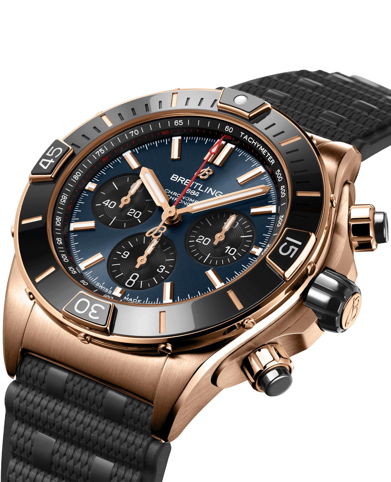 Мужские швейцарские лимитированные часы-хронографХронографФункция позволяет измерять отрезки времени с особой точностью: часы, минуты, секунды. Верным признаком хронографа является наличие на циферблате 3 дополнительных окошек-счётчиков. с секундомеромСекундомерСекундоме́р — прибор, способный измерять интервалы времени с точностью до долей секунды. Breitling Super Chronomat B01 44 RB01362A1C1S1, механический механизм (автоматический калибр) с высокой точностью. Модель Super Chronomat, вдохновленная оригинальными часами 1980-х годов, которые Breitling создала для пилотажной эскадрильи Frecce Tricolori, является самой смелой в семействе часов Chronomat. Сапфировое стеклоСапфировое стеклоПрочный и надёжный материал из кристалла сапфира синтетического происхождения, характеризующийся особой твёрдостью и устойчивостью к царапинам и повреждениям. устойчивое к появлению царапин, обладающее высокой прозрачностью. Класс водозащиты: 200 метров, позволит плавать, нырять и заниматься другими водными видами спорта. Корпус и безельБезельВнешний ободок, закрепляющий стекло. В спортивных часах так называется поворотное кольцо с делениями на циферблате, выполняет роль таймера – замеряет отрезки времени на шкале. Неподвижный безель – элемент декора. Однонаправленно вращающийся безель на дайверских часах позволяет фиксировать моменты погружения и выныривания на поверхность. часов изготовлены из красного 18-каратного золота18-каратное золотоОбозначение по каратной системе пробирования, оно показывает, сколько драгоценного металла содержится в изделии. 18 карат - в составе 75% чистого золота, соответствует 750 пробе.