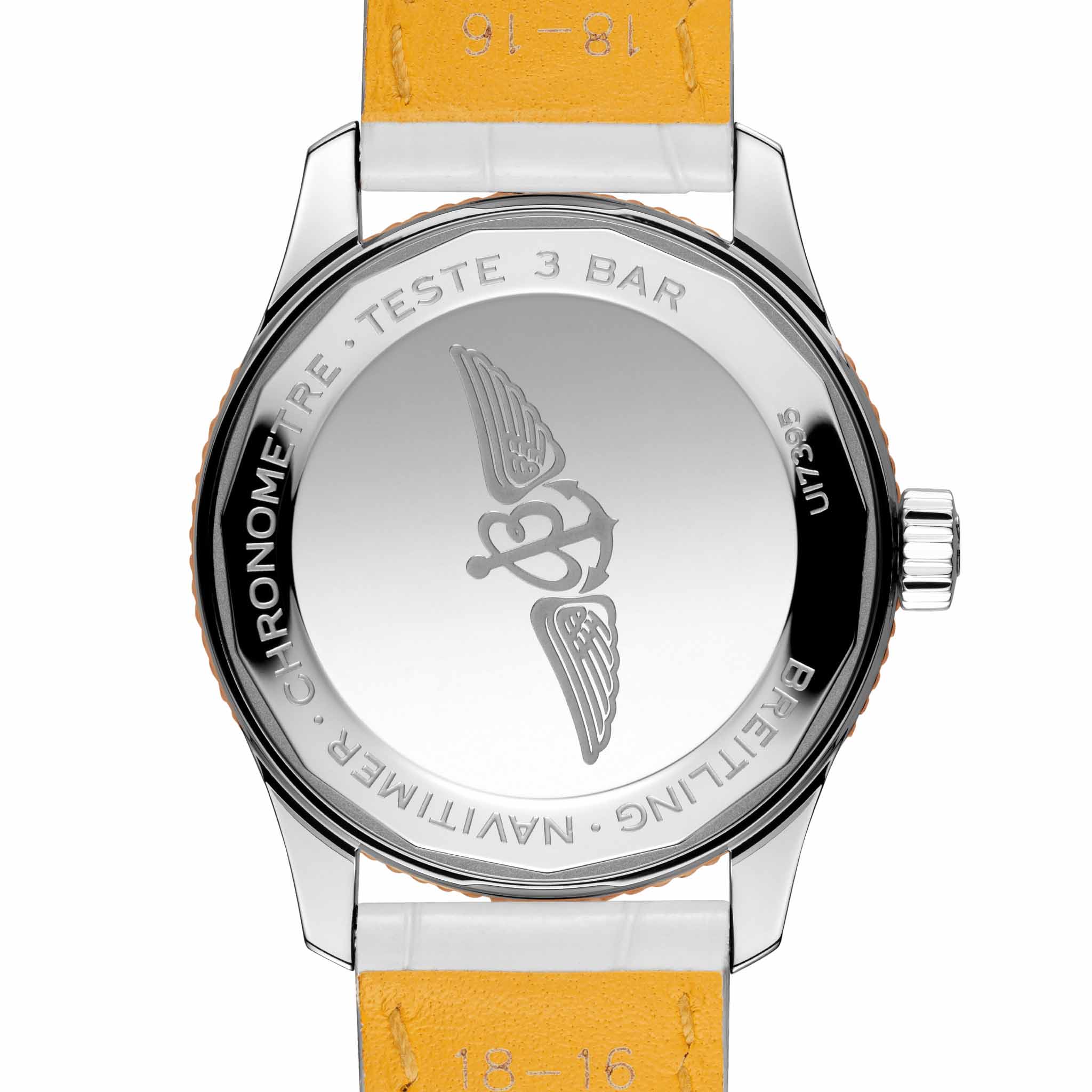 , а также белым перламутром в оправе из бриллиантов. Часы оснащены хронометром Breitling Caliber 17, сертифицированным COSCСертификат COSCОфициальный сертификат, подтверждающий то, что часы ходят с особо высокой точностью. Для получения документа часы подвергаются тестовым испытаниям, разработанным швейцарским институтом тестирования хронометров COSC. Допустимая норма для механических часов -4/+6 секунд в день, для кварцевых моделей +/- 0,07 секунд в день..