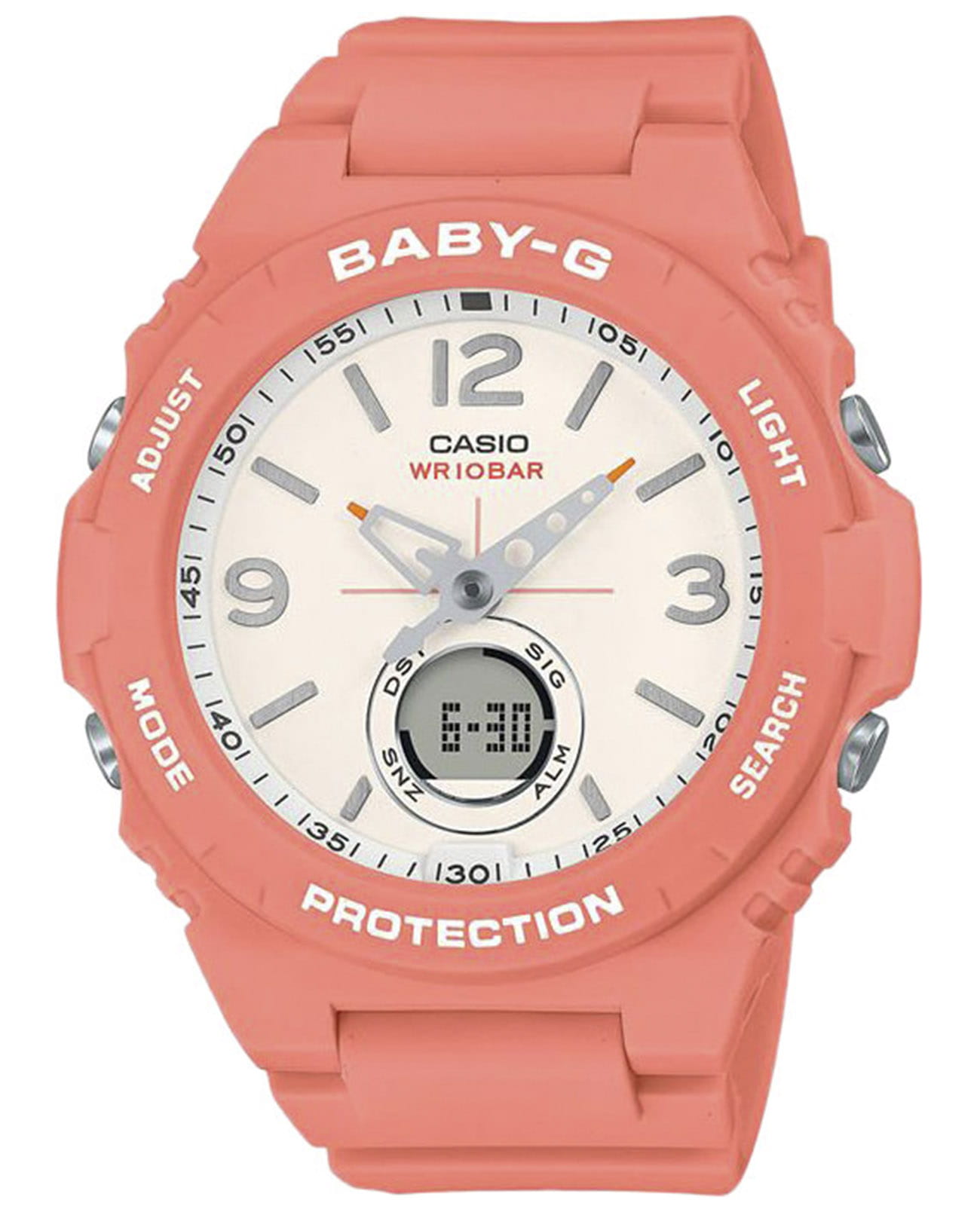 Модель из коллекции Baby-G представлена в оранжевом исполнении, солнечный оттенок акцентирует внимание на жизнерадостной натуре своего владельца. Женские японские наручные часы с противоударным корпусом Casio Baby-G BGA-260-4A, кварцевый механизм с высокой точностью. Класс водозащиты: 100 метров, позволит плавать, нырять и заниматься другими водными видами спорта. Корпус часов изготовлен из пластика. Ударопрочный корпусУдаропрочный корпусМеханизм заключён в корпус, выполненный из современных материалов, устойчивых к ударам, механическим повреждениям и падению с высоты: инновационный пластик, карбон, нержавеющая сталь, титан. защищает механизм от ударов и вибрации. Минималистичный циферблат дополнен стрелками необычной формы с яркими наконечниками, они имеют люминесцентное покрытиеЛюминесцентное покрытиеПозволяет считывать показания времени в темноте. Производители наносят на стрелки, часовые индексы, безель или поверхность циферблата светонакопительный состав, дающий холодное свечение. для лучшей считываемости показателей времени в темноте. Гибкий полимерный ремешок красиво смотрится в сочетании со спортивным или повседневным стилем. Светодиодная подсветкаСветодиодная подсветкаСветодиодная или LED-подсветка обеспечивает появление яркого холодного свечения за счёт LED-элементов - маленьких лампочек. Они потребляют минимальное количество энергии, чаще всего можно встретить 1 светодиод, в нижней части циферблата. дисплея. Цвет подсветки: белый. Подсветка NeobriteПодсветка NeobriteИспользование светонакопительных составов на основе сульфида цинка или алюмината стронция, яркий свет можно наблюдать на протяжении 6-10 часов после «зарядки» часов около источника света. обеспечивает длительное послесвечение в темноте даже после кратковременного нахождения на свету. Мировое времяМировое время Полезное часовое усложнение, отображающее время в основных городах и известных областях по всему миру, оно связано с часовыми поясами, удобно для путешественников и бизнесменов. – 27 городов (29 часовых поясов), всемирное координированное время (UTCUTCВсемирное кординационное время, не имеющее привязки к географическому положению Гринвича, основывается на атомном отсчёте времени. Регулировка времени осуществляется более точно, чем устаревшее GMT.