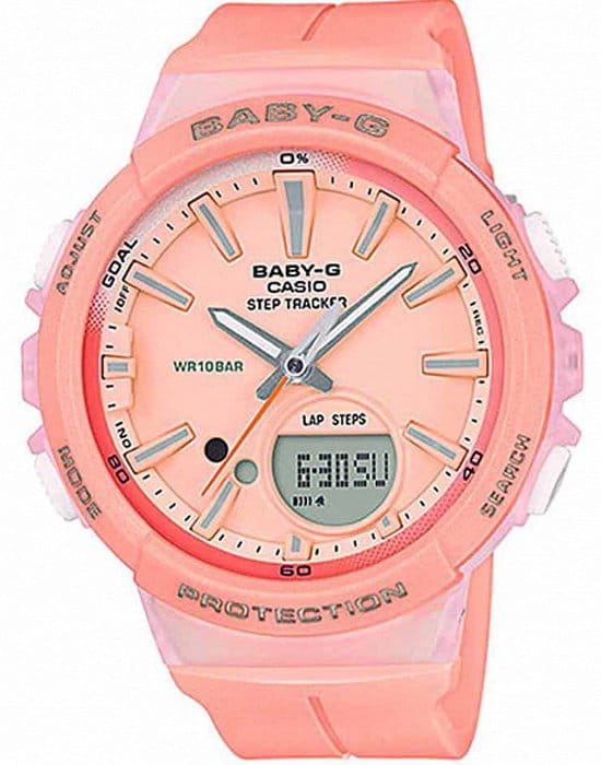 Спортивный аксессуар в персиковом цвете поможет держать себя в форме благодаря таймеру, секундомеру, шагомеру. Счётчик измеряет пройденное количество шагов в диапазоне от 0 до 999999. Вокруг безеляБезельВнешний ободок, закрепляющий стекло. В спортивных часах так называется поворотное кольцо с делениями на циферблате, выполняет роль таймера – замеряет отрезки времени на шкале. Неподвижный безель – элемент декора. Однонаправленно вращающийся безель на дайверских часах позволяет фиксировать моменты погружения и выныривания на поверхность. нанесена шкала в процентах. Она помогает отслеживать план на день, отметка «Goal» обозначает выполнение намеченной цели. Часы выдерживают нагрузки и падение за счёт полимерного противоударного корпусаУдаропрочный корпусМеханизм заключён в корпус, выполненный из современных материалов, устойчивых к ударам, механическим повреждениям и падению с высоты: инновационный пластик, карбон, нержавеющая сталь, титан.. Японский кварцевый механизм. Срок службы батарейки составляет 2 года. Светодиодная подсветкаСветодиодная подсветкаСветодиодная или LED-подсветка обеспечивает появление яркого холодного свечения за счёт LED-элементов - маленьких лампочек. Они потребляют минимальное количество энергии, чаще всего можно встретить 1 светодиод, в нижней части циферблата. ЖК-дисплея и циферблата. Стрелки с люминесцентным покрытиемЛюминесцентное покрытиеПозволяет считывать показания времени в темноте. Производители наносят на стрелки, часовые индексы, безель или поверхность циферблата светонакопительный состав, дающий холодное свечение.. Водозащита 10 бар. Календарь, будильник, второй часовой пояс. Габариты: 42,6 x 45,2 x 13,3 мм.