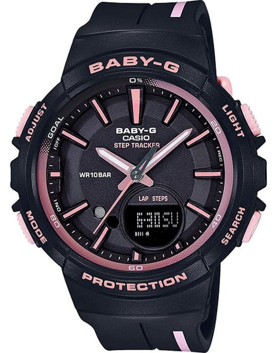 Японские женские часы-хронографХронографФункция позволяет измерять отрезки времени с особой точностью: часы, минуты, секунды. Верным признаком хронографа является наличие на циферблате 3 дополнительных окошек-счётчиков. Casio Baby-G BGS-100RT-1A из коллекции Baby-G. Минеральное стеклоМинеральное стеклоМинеральное стекло представляет собой искусственно выращенный минерал кварца. Такое стекло отличается особой устойчивостью к повреждениям и царапинам. Уступает по некоторым качествам сапфировому стеклу. устойчивое к появлению царапин, обладающее высокой прозрачностью. Корпус часов изготовлен из полимерного материала. Светонакопительное необритовое покрытиеПодсветка NeobriteИспользование светонакопительных составов на основе сульфида цинка или алюмината стронция, яркий свет можно наблюдать на протяжении 6-10 часов после «зарядки» часов около источника света. продолжает светиться в темноте даже после непродолжительного пребывания на свету. Ударопрочный корпусУдаропрочный корпусМеханизм заключён в корпус, выполненный из современных материалов, устойчивых к ударам, механическим повреждениям и падению с высоты: инновационный пластик, карбон, нержавеющая сталь, титан. защищает механизм от ударов и вибрации. Функция Мирового времениМировое время Полезное часовое усложнение, отображающее время в основных городах и известных областях по всему миру, оно связано с часовыми поясами, удобно для путешественников и бизнесменов. . СекундомерСекундомерСекундоме́р — прибор, способный измерять интервалы времени с точностью до долей секунды. с точностью измерения 1/100 секунды и измерением до 23 часов 59 минут 59,99 cек. ТаймерТаймерОтсчитывает секунды в обратном направлении в заданном интервале времени. обратного отсчета (диапазон времени 24 часа), автоматический календарь, 12/24 отображение времени. Шагомер измеряет количество шагов от 0 до 999999. Графическое отображение пройденных шагов за последние 5ч. История ежедневных данных за 8 дней, еженедельных данных за 4 недели. Установка цели в диапазоне от 1000 до 50 000. Звуковое напоминание об отсутствии активности. 5 ежедневных будильникаБудильникБуди́льник — часы, в заданный момент времени подающие звуковой, световой и/или в редких случаях другой сигнал.. Функция включения/отключения звука кнопок. Функция перемещения стрелок. Класс водозащиты: 100 метров, позволит плавать без погружения. Ремешок из полимерного материала на стандартной застежке.