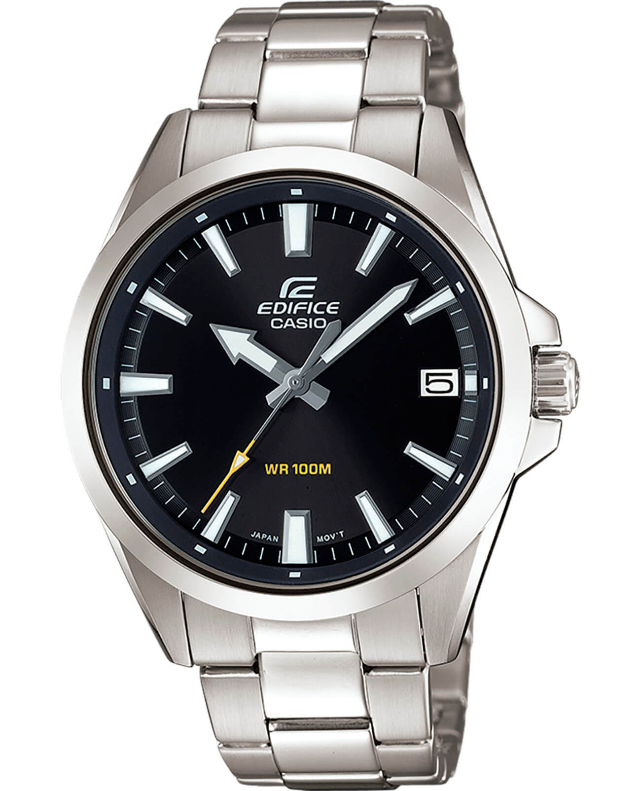 Брендовый аксессуар из серии EFV-100 будет отлично смотреться как с деловым костюмом, так и с повседневной одеждой. Стальной браслет на раскладной застёжкеРаскладная застёжкаТакой тип застёжки используется только на браслетах из металла. Она никогда не раскрывается полностью, происходит разделение на 2 и более частей. Раскладывающая застёжка снизит вероятность потери часов к минимуму.. Чёрный циферблат дополнен контрастными стрелками и метками, секундная стрелка облегчает читаемость показателей благодаря жёлтому наконечнику. Минималистичные часы выполнены из нержавеющей стали 316L, материал отличается долговечностью и устойчивостью к царапинам. Кварцевый механизм работает от батарейки, срок её службы составит 3 года. Подсветка NeobriteПодсветка NeobriteИспользование светонакопительных составов на основе сульфида цинка или алюмината стронция, яркий свет можно наблюдать на протяжении 6-10 часов после «зарядки» часов около источника света. продолжает светиться в темноте даже после непродолжительного пребывания на свету. Водостойкость 10 бар. Минеральное стеклоМинеральное стеклоМинеральное стекло представляет собой искусственно выращенный минерал кварца. Такое стекло отличается особой устойчивостью к повреждениям и царапинам. Уступает по некоторым качествам сапфировому стеклу.. Прямоугольная апертура даты. Габариты: 48 x 42 x 10,9 мм.