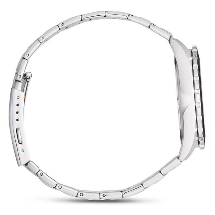 Серебристо-чёрная модель наделена элементами дайверского дизайна, повторяя внешний облик механических часов для дайвинга 1950-х годов, в глаза бросается массивный однонаправленно вращающийся безельБезельВнешний ободок, закрепляющий стекло. В спортивных часах так называется поворотное кольцо с делениями на циферблате, выполняет роль таймера – замеряет отрезки времени на шкале. Неподвижный безель – элемент декора. Однонаправленно вращающийся безель на дайверских часах позволяет фиксировать моменты погружения и выныривания на поверхность. с фигурным краем, крупные стрелки и часовые индексы. Секундная стрелка дополнена жёлтым наконечником, что обеспечивает превосходную читаемость показаний с циферблата. Кварцевый японский механизм с точностью хода часов +/- 20 секунд в месяц. Батарейка рассчитана на 3 года работы. Люминесцентная подсветка NeobriteПодсветка NeobriteИспользование светонакопительных составов на основе сульфида цинка или алюмината стронция, яркий свет можно наблюдать на протяжении 6-10 часов после «зарядки» часов около источника света.. Водонепроницаемость при давлении до 10 бар. Ударопрочный корпусУдаропрочный корпусМеханизм заключён в корпус, выполненный из современных материалов, устойчивых к ударам, механическим повреждениям и падению с высоты: инновационный пластик, карбон, нержавеющая сталь, титан. и браслет из нержавеющей стали 316L. Чёрное IP-покрытиеIP-покрытиеМетод ионного напыления. Демонстрирует повышенную устойчивость к истиранию, окислению и химическим веществам. Под воздействием высокого давления и температуры около 1500°C молекулы металла надёжно соединяются с частицами корпуса часов.. Минеральное стекло. Окошко индикации числа. Габариты: 42 x 37,8 x 9,4 мм.