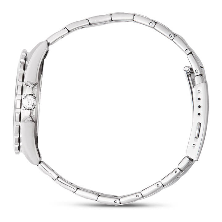 Светло-серебристая модель наделена элементами дайверского дизайна, повторяя внешний облик механических часов для дайвинга 1950-х годов, в глаза бросается массивный однонаправленно вращающийся безельБезельВнешний ободок, закрепляющий стекло. В спортивных часах так называется поворотное кольцо с делениями на циферблате, выполняет роль таймера – замеряет отрезки времени на шкале. Неподвижный безель – элемент декора. Однонаправленно вращающийся безель на дайверских часах позволяет фиксировать моменты погружения и выныривания на поверхность., крупные стрелки и часовые индексы. Секундная стрелка дополнена голубым наконечником, что обеспечивает превосходную читаемость показаний с циферблата. Кварцевый японский механизм с точностью хода часов +/- 20 секунд в месяц. Батарейка рассчитана на 3 года работы. Люминесцентная подсветка NeobriteПодсветка NeobriteИспользование светонакопительных составов на основе сульфида цинка или алюмината стронция, яркий свет можно наблюдать на протяжении 6-10 часов после «зарядки» часов около источника света.. Водонепроницаемость при давлении до 10 бар. Ударопрочный корпусУдаропрочный корпусМеханизм заключён в корпус, выполненный из современных материалов, устойчивых к ударам, механическим повреждениям и падению с высоты: инновационный пластик, карбон, нержавеющая сталь, титан. и браслет из нержавеющей стали 316L. Чёрное IP-покрытиеIP-покрытиеМетод ионного напыления. Демонстрирует повышенную устойчивость к истиранию, окислению и химическим веществам. Под воздействием высокого давления и температуры около 1500°C молекулы металла надёжно соединяются с частицами корпуса часов.. Минеральное стекло. Окошко индикации числа. Габариты: 42 x 37,8 x 9,4 мм.