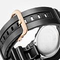 Компактный аксессуар имеет противоударный корпусУдаропрочный корпусМеханизм заключён в корпус, выполненный из современных материалов, устойчивых к ударам, механическим повреждениям и падению с высоты: инновационный пластик, карбон, нержавеющая сталь, титан. из полимерного материала, способного выдерживать падения с высоты и повреждения. Привлекательно смотрится безельБезельВнешний ободок, закрепляющий стекло. В спортивных часах так называется поворотное кольцо с делениями на циферблате, выполняет роль таймера – замеряет отрезки времени на шкале. Неподвижный безель – элемент декора. Однонаправленно вращающийся безель на дайверских часах позволяет фиксировать моменты погружения и выныривания на поверхность. из нержавеющей стали 316L с IP-покрытиемIP-покрытиеМетод ионного напыления. Демонстрирует повышенную устойчивость к истиранию, окислению и химическим веществам. Под воздействием высокого давления и температуры около 1500°C молекулы металла надёжно соединяются с частицами корпуса часов., а также детали в цвете розового золота. Аналого-цифровые часы работают от батарейки, рассчитанной на 3 года безупречной эксплуатации. Минеральное стекло. Автоматическая светодиодная подсветкаСветодиодная подсветкаСветодиодная или LED-подсветка обеспечивает появление яркого холодного свечения за счёт LED-элементов - маленьких лампочек. Они потребляют минимальное количество энергии, чаще всего можно встретить 1 светодиод, в нижней части циферблата. дисплея, стрелки и метки с люминесцентным покрытиемЛюминесцентное покрытиеПозволяет считывать показания времени в темноте. Производители наносят на стрелки, часовые индексы, безель или поверхность циферблата светонакопительный состав, дающий холодное свечение.. 12/24-часовое отображение времени. Надёжный полимерный ремешок. Водонепроницаемость 200 метров. Дополнительные возможности: таймер, будильник, мировое времяМировое время Полезное часовое усложнение, отображающее время в основных городах и известных областях по всему миру, оно связано с часовыми поясами, удобно для путешественников и бизнесменов. , секундомер, автоматический календарь. Габариты: 46,4 x 52 x 14,9 мм.