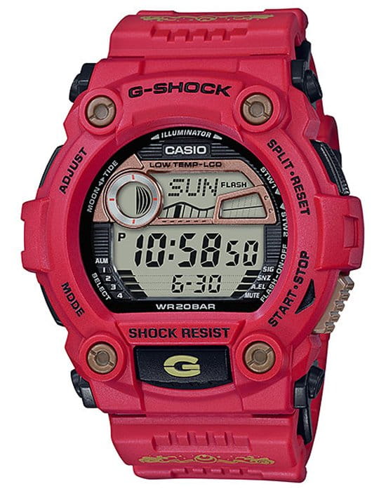 Аксессуар выпущен в честь «семи счастливых богов» из японской мифологии. Узнаваемой чертой дизайна стали 4 винта на лицевой части противоударного корпусаУдаропрочный корпусМеханизм заключён в корпус, выполненный из современных материалов, устойчивых к ударам, механическим повреждениям и падению с высоты: инновационный пластик, карбон, нержавеющая сталь, титан., крупные кнопки с ребристой поверхностью и многочисленные узоры. Это подходящий вариант для любителей зимних видов спорта, так как среди свойств модели отмечается устойчивость к температурам даже ниже -20 °C. Японский кварцевый механизм работает от батарейки, срок её службы рассчитан на 2 года. Электролюминесцентная подсветкаЭлектролюминесцентная подсветкаЭлектролюминесцентная панель устанавливается под ЖК-экраном часов, при нажатии кнопки электричество преобразуется в свет за счёт подачи напряжения на атомы фосфора, такой тип подсветки позволяет освещать весь циферблат. полностью освещает циферблат. Минеральное стекло. Высокие показатели водонепроницаемости до 20 бар. Функции: отображение возраста и фаз луны, индикация графика приливов и отливов, секундомер, 5 будильников, мировое времяМировое время Полезное часовое усложнение, отображающее время в основных городах и известных областях по всему миру, оно связано с часовыми поясами, удобно для путешественников и бизнесменов. , календарь, таймер. Габариты: 46,2 x 45,4 x 13,6 мм.