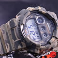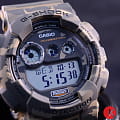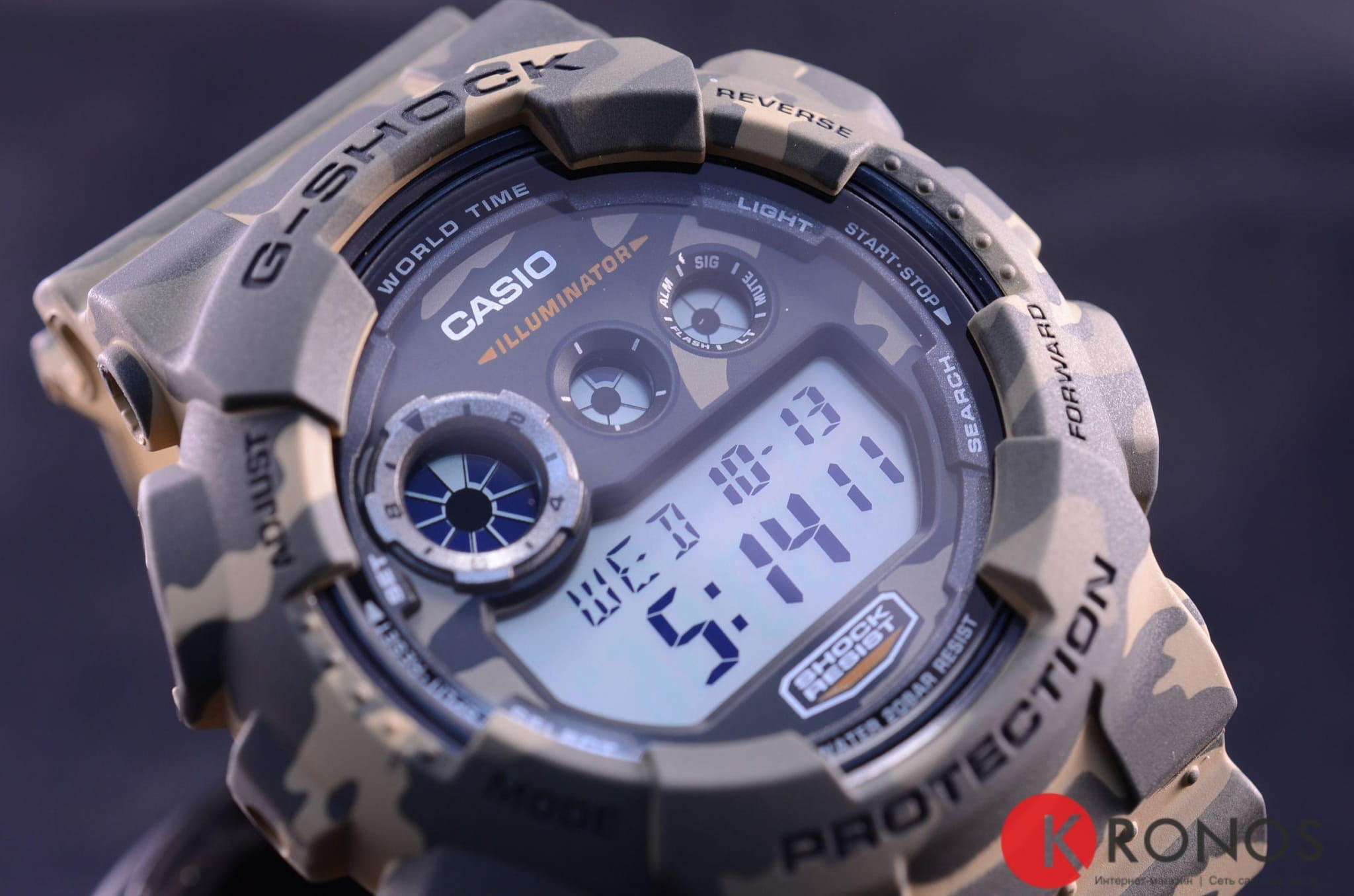 Наручные часы обладают внушительными размерами, благодаря массивному ударопрочному корпусуУдаропрочный корпусМеханизм заключён в корпус, выполненный из современных материалов, устойчивых к ударам, механическим повреждениям и падению с высоты: инновационный пластик, карбон, нержавеющая сталь, титан. и необычному дизайну они приметно смотрятся на запястье. Их поверхность имеет камуфляжный принт в песочно-болотной расцветке, циферблат же оставлен в минималистичном исполнении. Японский кварцевый механизм работает за счёт батарейки, срок службы которой составляет 7 лет. Корпус и браслет из высокопрочного пластика. Автоматическая светодиодная подсветкаСветодиодная подсветкаСветодиодная или LED-подсветка обеспечивает появление яркого холодного свечения за счёт LED-элементов - маленьких лампочек. Они потребляют минимальное количество энергии, чаще всего можно встретить 1 светодиод, в нижней части циферблата.. Закаленное минеральное стекло. Водозащита 200 метров. Включение и выключение функции кнопок. Функции: таймер обратного отсчёта, 5 будильников, хронографХронографФункция позволяет измерять отрезки времени с особой точностью: часы, минуты, секунды. Верным признаком хронографа является наличие на циферблате 3 дополнительных окошек-счётчиков., секундомер, мировое времяМировое время Полезное часовое усложнение, отображающее время в основных городах и известных областях по всему миру, оно связано с часовыми поясами, удобно для путешественников и бизнесменов. . Габариты: 55 x 51,2 x 17,4 мм.