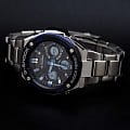 Наручные часы с синими деталями представляют собой действительно универсальный аксессуар. Их особенность заключается в наличии противоударного корпусаУдаропрочный корпусМеханизм заключён в корпус, выполненный из современных материалов, устойчивых к ударам, механическим повреждениям и падению с высоты: инновационный пластик, карбон, нержавеющая сталь, титан. с усиленной конструкцией: между слоями из нержавеющей стали 316L есть амортизирующая прокладка из полимерного материала. Это позволяет японскому кварцевому механизму оставаться максимально защищённым. Энергия для функционирования запасается солнечной батареей - технология . Индикатор уровня заряда аккумулятора. Возможность перемещения стрелок для удобной читаемости показателей с циферблата. Водозащита 20 бар. СветодиоднаяСветодиодная подсветкаСветодиодная или LED-подсветка обеспечивает появление яркого холодного свечения за счёт LED-элементов - маленьких лампочек. Они потребляют минимальное количество энергии, чаще всего можно встретить 1 светодиод, в нижней части циферблата. и люминесцентная подсветкаЛюминесцентное покрытиеПозволяет считывать показания времени в темноте. Производители наносят на стрелки, часовые индексы, безель или поверхность циферблата светонакопительный состав, дающий холодное свечение.. Надёжный стальной браслет. Коррекция текущего времени радиосигналом, мировое времяМировое время Полезное часовое усложнение, отображающее время в основных городах и известных областях по всему миру, оно связано с часовыми поясами, удобно для путешественников и бизнесменов. , таймер, 5 будильников, хронографХронографФункция позволяет измерять отрезки времени с особой точностью: часы, минуты, секунды. Верным признаком хронографа является наличие на циферблате 3 дополнительных окошек-счётчиков., секундомер, UTCUTCВсемирное кординационное время, не имеющее привязки к географическому положению Гринвича, основывается на атомном отсчёте времени. Регулировка времени осуществляется более точно, чем устаревшее GMT.