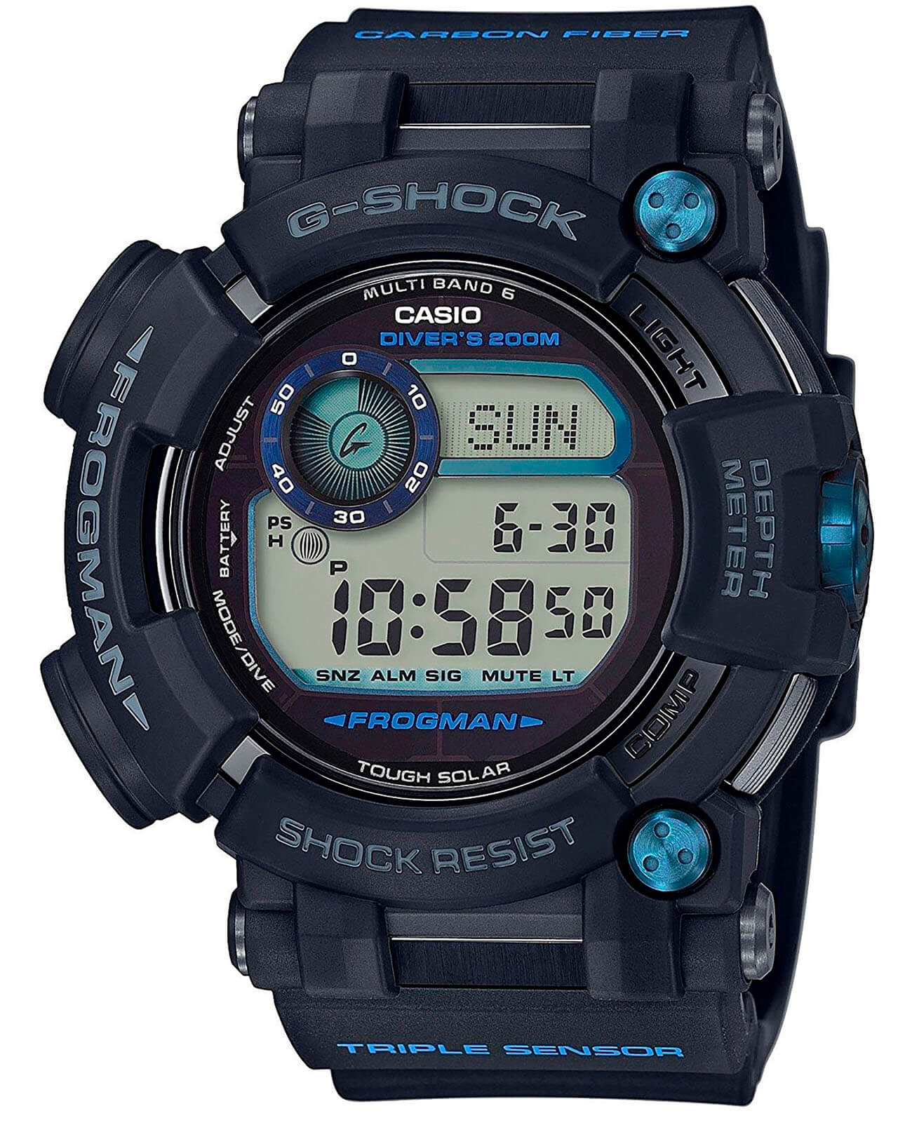). Индикатор уровня заряда аккумулятора. Ударопрочный корпусУдаропрочный корпусМеханизм заключён в корпус, выполненный из современных материалов, устойчивых к ударам, механическим повреждениям и падению с высоты: инновационный пластик, карбон, нержавеющая сталь, титан. из пластика. Минеральное стекло. Водозащита 20 бар. Автоматическая светодиодная подсветкаСветодиодная подсветкаСветодиодная или LED-подсветка обеспечивает появление яркого холодного свечения за счёт LED-элементов - маленьких лампочек. Они потребляют минимальное количество энергии, чаще всего можно встретить 1 светодиод, в нижней части циферблата.. Функция включения/отключения летнего времени. Время восхода и захода Солнца на определенную дату. Указатели дневного света. Высотомер - встроенный датчик барометрического давления с возможностью вывода результатов в единицах высоты над уровнем моря (от -700 до 10000 метров). Память данных высотометра до 40 записей. График набора высоты. Барометр - измерение атмосферного давления от 260 до 1100 гПа (от 195 до 825 мм рт. ст.). Встроенный датчик температуры от -10° до +60°С с точностью 0,1°C. Цифровой компас. Диапазон измерения от 0° до 359° с точностью 1°. Коррекция магнитного склонения. С помощью кнопки часов можно записать ваше текущее местоположение с помощью приложения. Затем секундная стрелка указывает направление к записанному местоположению, а цифровой дисплей показывает расстояние до местоположения. Технология Multi Band 6 позволяет принимать сигналы от шести радиовышек, расположенных в различных точках земного шара, которые передают временные сигналы из определенных атомных часов. Коррекция текущего времени радиосигналом почти по всему миру: Англия, Германия, США, Япония и Китай. Функция отключения/включения звука. Стальная задняя крышка крепится на 4-х винтах. Класс водозащиты: 200 метров, позволит плавать, нырять и заниматься другими водными видами спорта. Ремешок из полимерного материала на стандартной застежке.