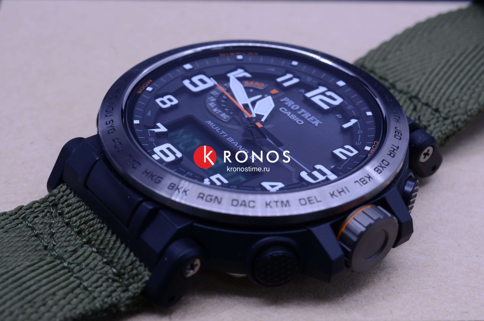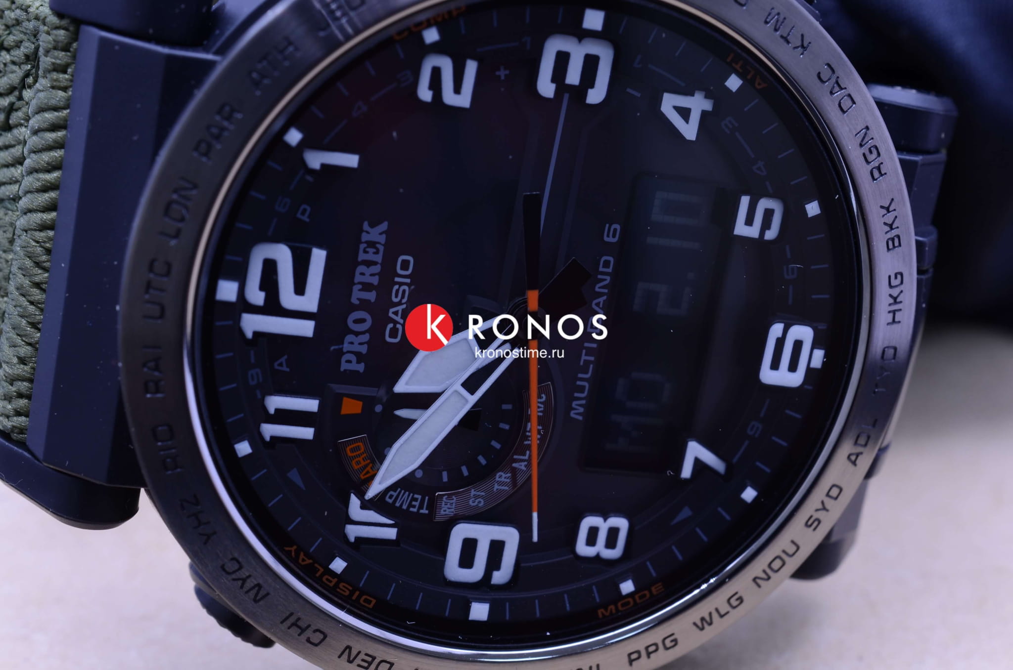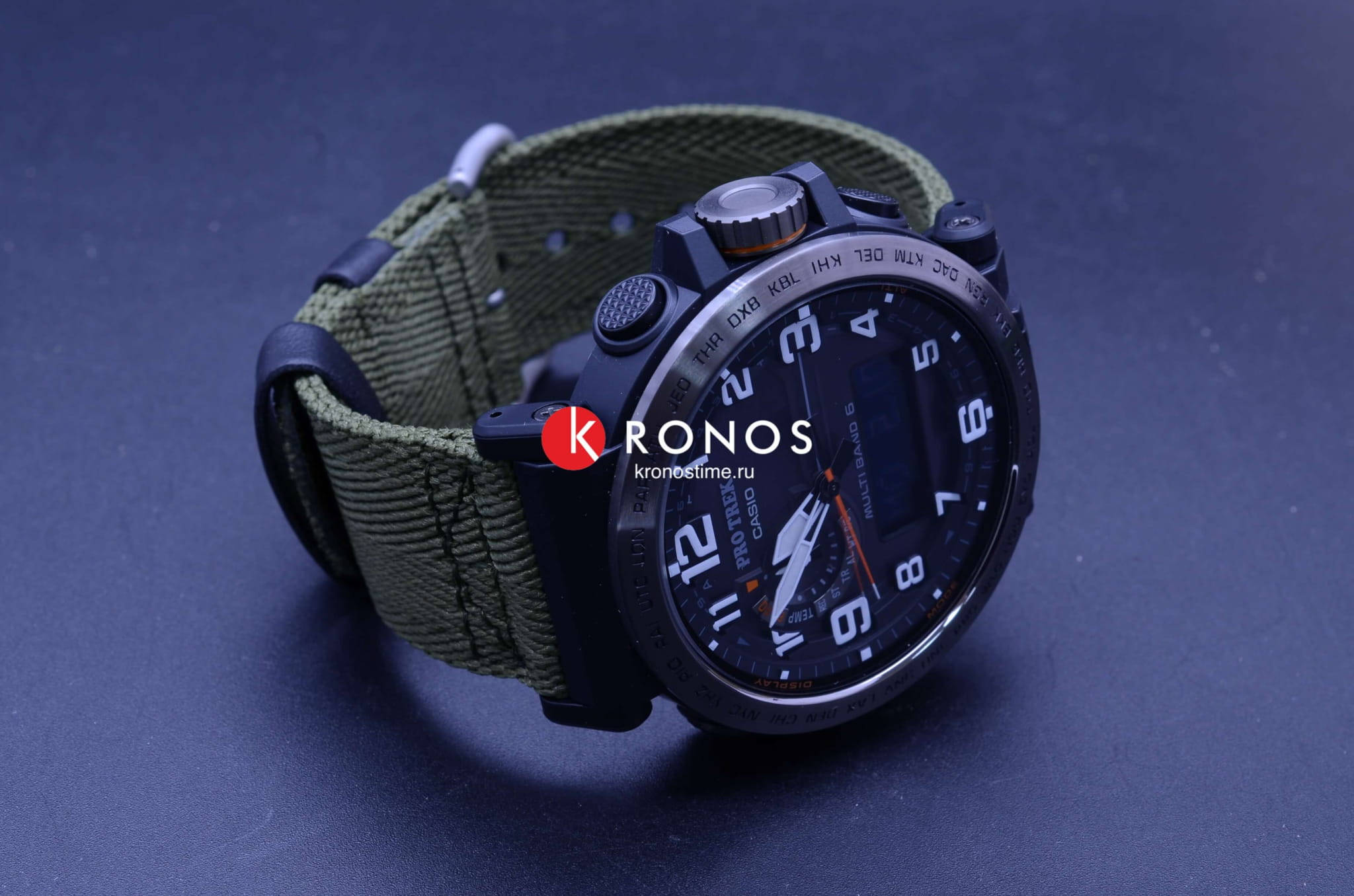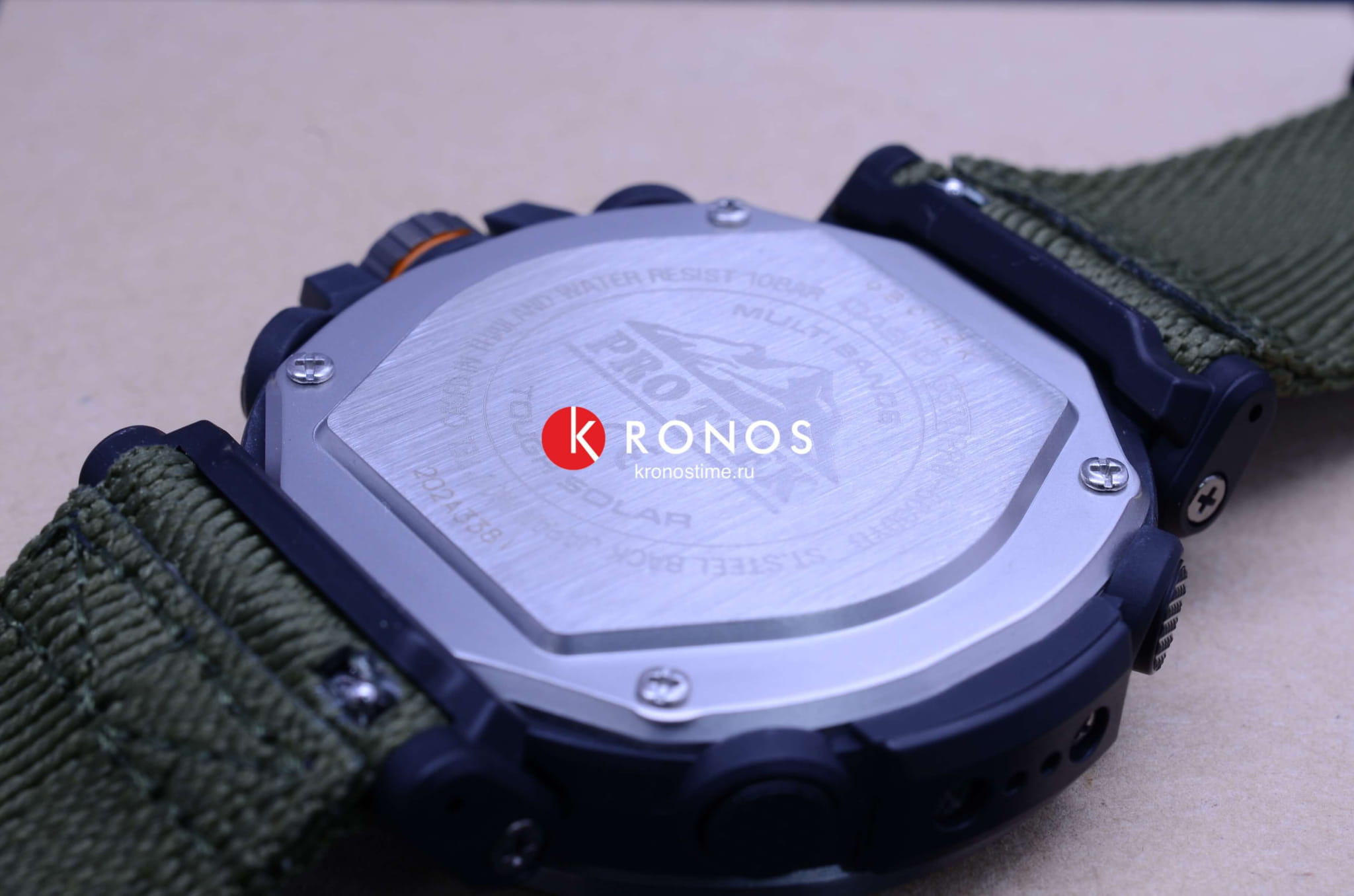 , секундомер, хронографХронографФункция позволяет измерять отрезки времени с особой точностью: часы, минуты, секунды. Верным признаком хронографа является наличие на циферблате 3 дополнительных окошек-счётчиков., календарь, мировое времяМировое время Полезное часовое усложнение, отображающее время в основных городах и известных областях по всему миру, оно связано с часовыми поясами, удобно для путешественников и бизнесменов. – 29 часовых поясов. Это часы на солнечной батарее , функция сохранения энергии позволяет модели работать без подзарядки на протяжении 25 месяцев. Текстильный ремешок цвета хаки. Ударопрочный корпусУдаропрочный корпусМеханизм заключён в корпус, выполненный из современных материалов, устойчивых к ударам, механическим повреждениям и падению с высоты: инновационный пластик, карбон, нержавеющая сталь, титан. из пластика и стали 316L с IP-покрытиемIP-покрытиеМетод ионного напыления. Демонстрирует повышенную устойчивость к истиранию, окислению и химическим веществам. Под воздействием высокого давления и температуры около 1500°C молекулы металла надёжно соединяются с частицами корпуса часов.. Минеральное стекло. Устойчивость к температурам ниже -10°C. Двойная светодиодная подсветкаСветодиодная подсветкаСветодиодная или LED-подсветка обеспечивает появление яркого холодного свечения за счёт LED-элементов - маленьких лампочек. Они потребляют минимальное количество энергии, чаще всего можно встретить 1 светодиод, в нижней части циферблата.. Класс водостойкости WR 100. Габариты: 51,6 x 51,5 x 13,4 мм.