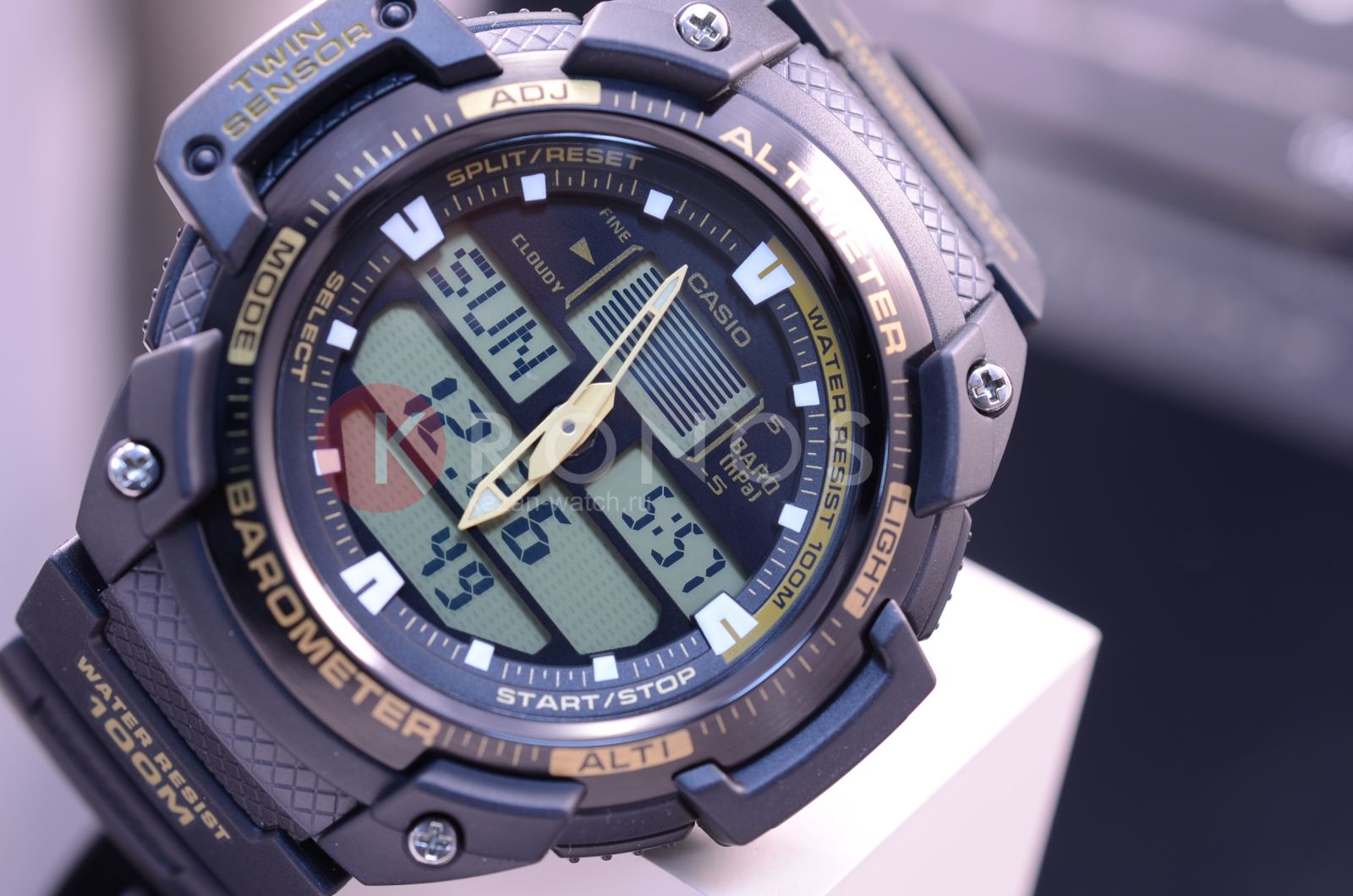 Спортивные японские мужские часы. Оснащены датчиком температуры, альтиметром, барометром и удобной электролюминесцентной подсветкой, освещающей весь циферблат. Корпус - Пластиковый; Стекло - Пластик; Водозащита - 100 м. (WR 100); Материал ремешка - Каучуковый; Цвет ремешка - Черный; Цвет циферблата - Lcd.