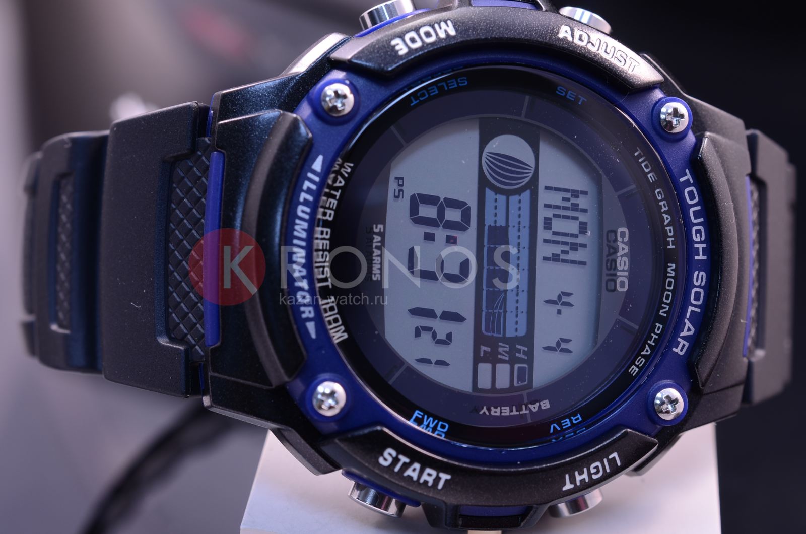 Цифровой способ отображения времени. Светодиодная подсветкаСветодиодная подсветкаСветодиодная или LED-подсветка обеспечивает появление яркого холодного свечения за счёт LED-элементов - маленьких лампочек. Они потребляют минимальное количество энергии, чаще всего можно встретить 1 светодиод, в нижней части циферблата.. Часы работают от солнечной батарейки, которая функционирует от преобразованного в электроэнергию света. Отображается информация о росте и фазе луны, сведения о приливах и отливах.
