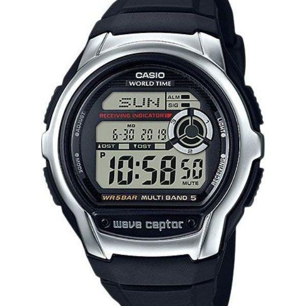 Высокотехнологичные японские наручные мужские часы. Корпус и ремешок из пластика черного цвета. Водонепроницаемость 5 ATM.  Часы оснащены такими функциями как секундомер, таймер обратного отсчета, будильник, мировое время, второй часовой пояс, прием радиосигнала.