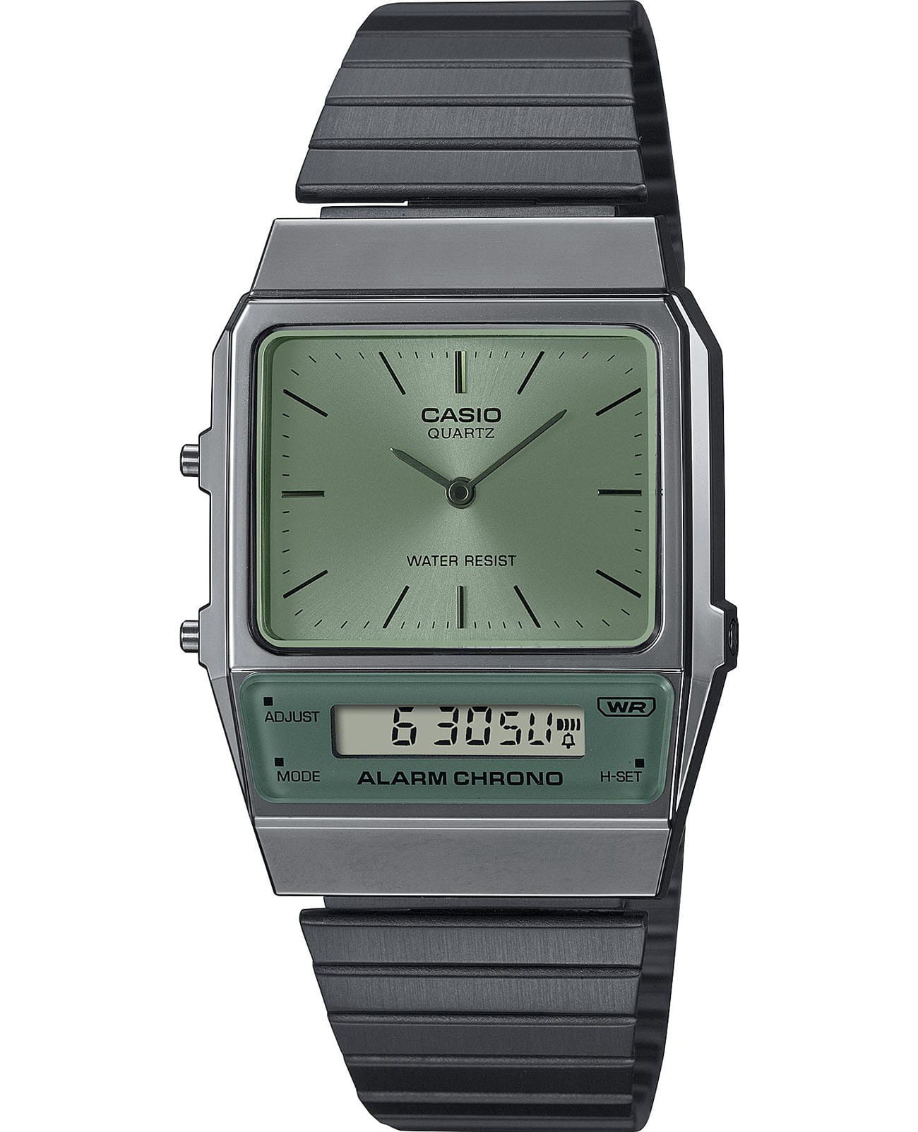 Спортивные японские унисекс часы с секундомеромСекундомерСекундоме́р — прибор, способный измерять интервалы времени с точностью до долей секунды. Casio Vintage AQ-800ECGG-3A, кварцевый механизм с высокой точностью. Класс водозащиты: 30 метров, позволит защитить корпус от случайных брызг или капель дождя. Корпус часов изготовлен из пластика серебристого цвета. На белом циферблате центральные часовая и минутная стрелки. Отдельно вынесен дополнительный циферблат мирового времениМировое время Полезное часовое усложнение, отображающее время в основных городах и известных областях по всему миру, оно связано с часовыми поясами, удобно для путешественников и бизнесменов. , позволяющий одновременно отобразить время двух часовых поясов. У модели присутствуют функции секундомераСекундомерСекундоме́р — прибор, способный измерять интервалы времени с точностью до долей секунды. с точностью 1/100 секунды и пределом измерения 1 час, ежедневного будильникаБудильникБуди́льник — часы, в заданный момент времени подающие звуковой, световой и/или в редких случаях другой сигнал.. Стальной браслет с регулируемой застежкой.