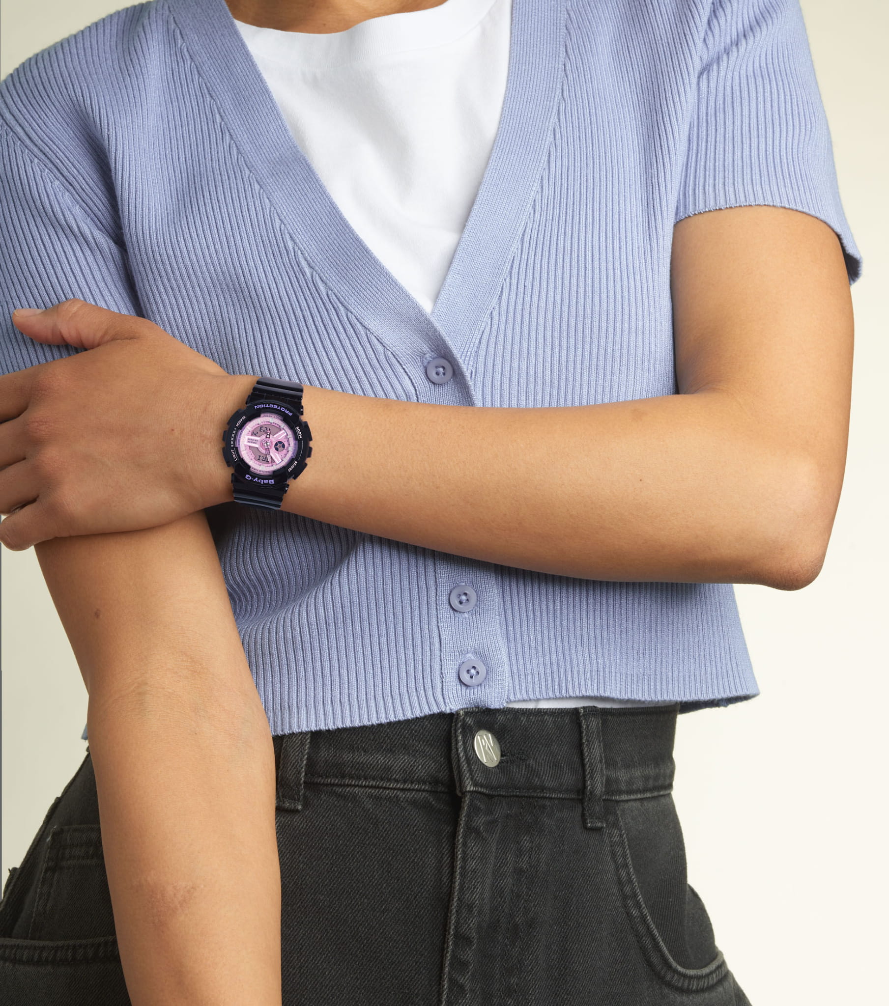 Японские женские часы противоударные Casio Baby-G BA-110PL-1A, кварцевый механизм с высокой точностью. Класс водозащиты: 100 метров, позволит плавать, нырять и заниматься другими водными видами спорта. Корпус часов изготовлен из пластика, цвета.