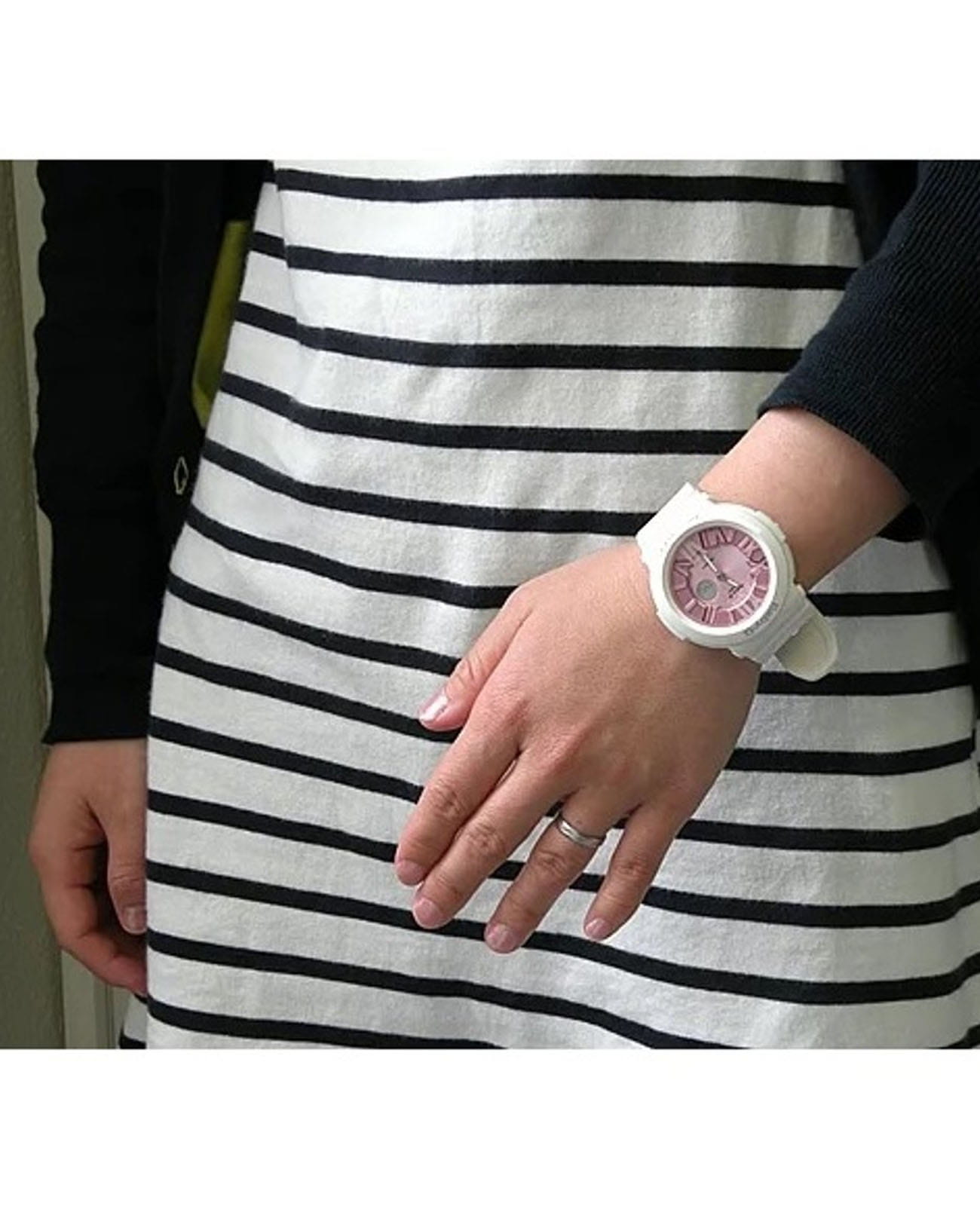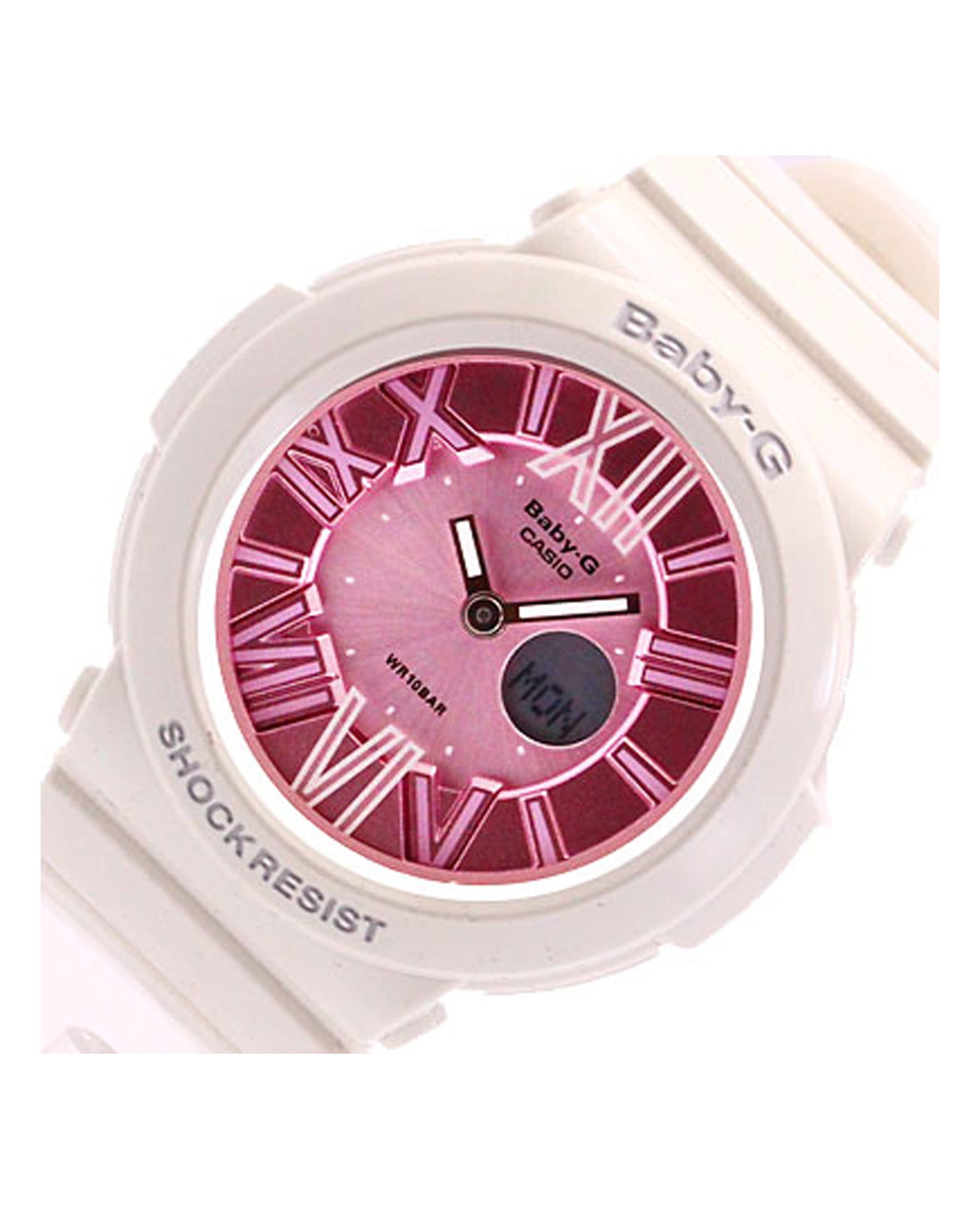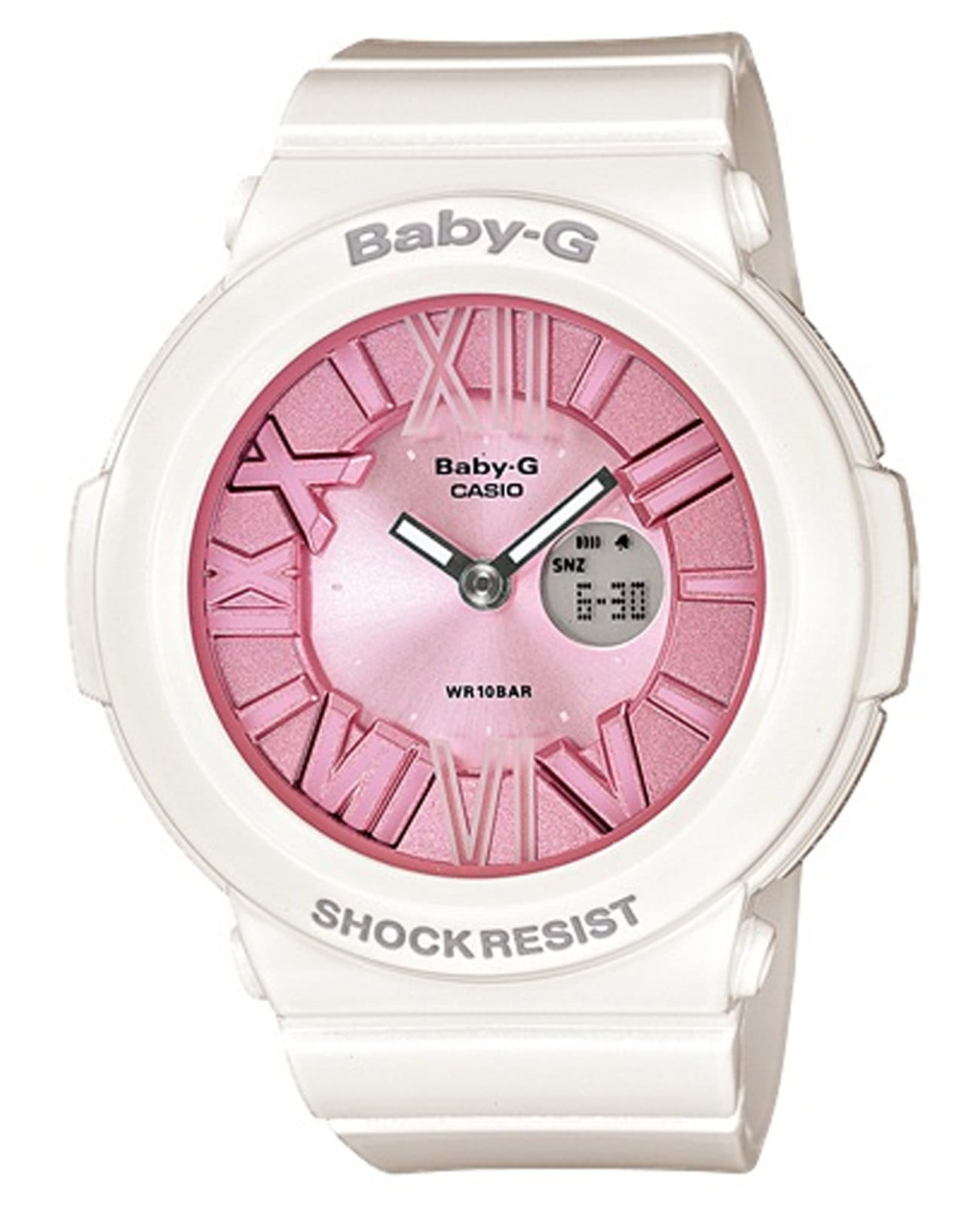 Японские женские часы-хронографХронографФункция позволяет измерять отрезки времени с особой точностью: часы, минуты, секунды. Верным признаком хронографа является наличие на циферблате 3 дополнительных окошек-счётчиков. часы Casio Baby-G BGA-161-7B2 из коллекции Baby-G. Серия, которая выражает спортивность и цвет, которые являются основой бренда Baby-G. Минеральное стеклоМинеральное стеклоМинеральное стекло представляет собой искусственно выращенный минерал кварца. Такое стекло отличается особой устойчивостью к повреждениям и царапинам. Уступает по некоторым качествам сапфировому стеклу. устойчивое к появлению царапин, обладающее высокой прозрачностью. Ударопрочный корпусУдаропрочный корпусМеханизм заключён в корпус, выполненный из современных материалов, устойчивых к ударам, механическим повреждениям и падению с высоты: инновационный пластик, карбон, нержавеющая сталь, титан. защищает механизм от ударов и вибрации. Циферблат подсвечивается подсветкой Neon IlluminatorNeon IlluminatorУникальная подсветка циферблата. На индексы наносятся специальные флуоресцентные чернила, которые подсвечиваются светодиодной подсветкой. ,  благодаря наличию функции задержки, после отпускания кнопки освещение горит еще несколько секунд. Функция Мирового времениМировое время Полезное часовое усложнение, отображающее время в основных городах и известных областях по всему миру, оно связано с часовыми поясами, удобно для путешественников и бизнесменов. . СекундомерСекундомерСекундоме́р — прибор, способный измерять интервалы времени с точностью до долей секунды. с точностью измерения 1/100 секунды и измерением до 23 часов 59 минут 59,99 cек. ТаймерТаймерОтсчитывает секунды в обратном направлении в заданном интервале времени. обратного отсчета (диапазон времени 24 часа),  автоматический календарь, 12/24 отображение времени. 5 ежедневных будильниковБудильникБуди́льник — часы, в заданный момент времени подающие звуковой, световой и/или в редких случаях другой сигнал., один с функцией Snooze. Класс водозащиты: 100 метров, позволит плавать без погружения. Ремешок из полимерного материала на стандартной застежке.
