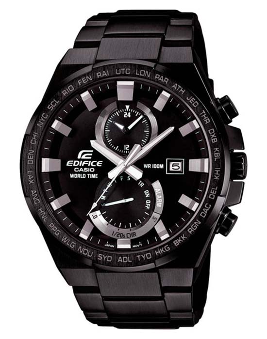 Мужские часы на стальном браслете с будильником и вторым временем. Casio Edifice EFR-542BK-1A, кварцевый механизм с высокой точностью. Класс водозащиты: 100 метров, позволит плавать, нырять и заниматься другими водными видами спорта. Корпус часов изготовлен из стали, цвета.