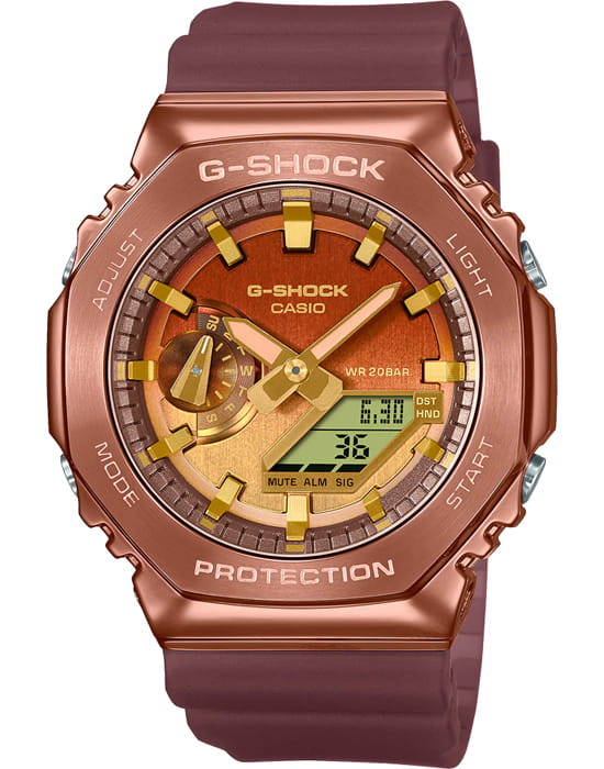 Японские ударопрочныеУдаропрочный корпусМеханизм заключён в корпус, выполненный из современных материалов, устойчивых к ударам, механическим повреждениям и падению с высоты: инновационный пластик, карбон, нержавеющая сталь, титан. мужские часы-хронографХронографФункция позволяет измерять отрезки времени с особой точностью: часы, минуты, секунды. Верным признаком хронографа является наличие на циферблате 3 дополнительных окошек-счётчиков. Casio G-Shock GM-2100CL-5ADR (GM-2100CL-5a). Сверхмощная двойная подсветка. При нажатии на кнопку подсветки циферблат часов освещает светодиод, а также отдельно подсвечивается цифровой дисплей. На стрелки часов нанесено NeobriteПодсветка NeobriteИспользование светонакопительных составов на основе сульфида цинка или алюмината стронция, яркий свет можно наблюдать на протяжении 6-10 часов после «зарядки» часов около источника света.-покрытие. Полный автокалендарь (до 2099 года). Включение/выключение звукового сигнала нажатия кнопки. 12/24-часовой формат времени. Мировое время Мировое время Полезное часовое усложнение, отображающее время в основных городах и известных областях по всему миру, оно связано с часовыми поясами, удобно для путешественников и бизнесменов. 31 часовой пояс (48 городов + всемирное координированное время), переход на летнее время вкл./выкл. СекундомерСекундомерСекундоме́р — прибор, способный измерять интервалы времени с точностью до долей секунды.. ТаймерТаймерОтсчитывает секунды в обратном направлении в заданном интервале времени.. 5 ежедневных будильников. Почасовой сигнал времени. Класс водозащиты: 200 метров, позволит плавать, нырять и заниматься другими водными видами спорта. Пластиковый ремешок на стандартной застежке.