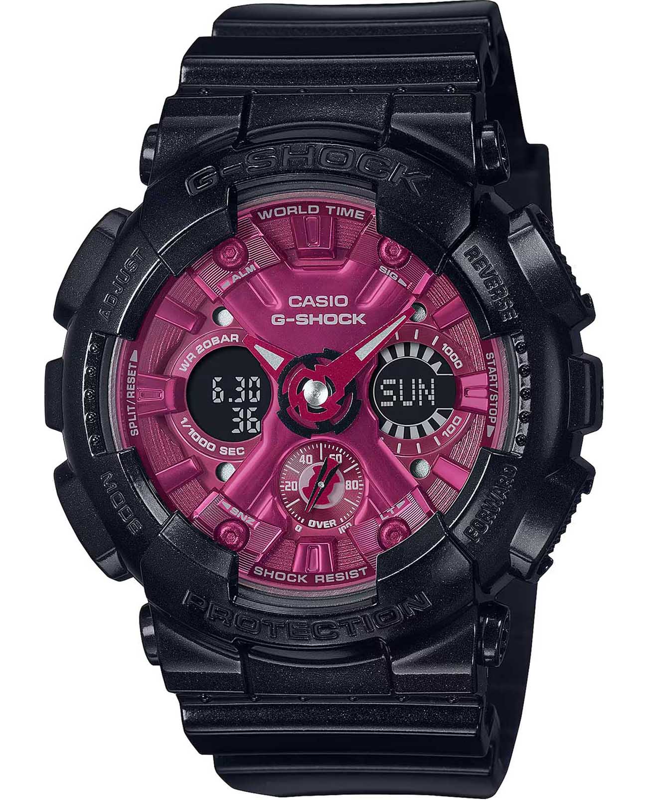 Японские женские часы-хронографХронографФункция позволяет измерять отрезки времени с особой точностью: часы, минуты, секунды. Верным признаком хронографа является наличие на циферблате 3 дополнительных окошек-счётчиков. Casio G-Shock GMA-S120RB-1ADR (GMA-S120RB-1a). Без сомнения, эти яркие и аутентичные джишоки способны приковать к себе внимание и украсить любое, даже самое изящное женское запястье. Минеральное стеклоМинеральное стеклоМинеральное стекло представляет собой искусственно выращенный минерал кварца. Такое стекло отличается особой устойчивостью к повреждениям и царапинам. Уступает по некоторым качествам сапфировому стеклу. устойчивое к появлению царапин, обладающее высокой прозрачностью. Ударопрочный корпусУдаропрочный корпусМеханизм заключён в корпус, выполненный из современных материалов, устойчивых к ударам, механическим повреждениям и падению с высоты: инновационный пластик, карбон, нержавеющая сталь, титан. защищает механизм от ударов и вибрации. Многокомпонентный циферблат состоит из цифровых окошек указателей числа и дня недели, а также индикатора режима работы часов, который расположен в позиции 9 часов и выполнен в виде пропеллера. Светодиодная автоподсветка - при повороте часов в сторону лица подсветка дисплея осуществляется автоматически. Настраиваемое послесвечение 1,5 или 3сек. Мировое времяМировое время Полезное часовое усложнение, отображающее время в основных городах и известных областях по всему миру, оно связано с часовыми поясами, удобно для путешественников и бизнесменов. – 48 городов (29 часовых поясов). СекундомерСекундомерСекундоме́р — прибор, способный измерять интервалы времени с точностью до долей секунды. с точностью измерения 1/100 секунды и измерением до 23 часов 59 минут 59,99 cек. ТаймерТаймерОтсчитывает секунды в обратном направлении в заданном интервале времени. обратного отсчета (диапазон времени 24 часа), автоматический календарь, 12/24 отображение времени. 5 будильниковБудильникБуди́льник — часы, в заданный момент времени подающие звуковой, световой и/или в редких случаях другой сигнал., один с функцией Snooze, ежечасный сигнал. Класс водозащиты: 200 метров, позволит плавать, нырять и заниматься другими водными видами спорта. Ремешок из полимерного материала на стандартной застежке.