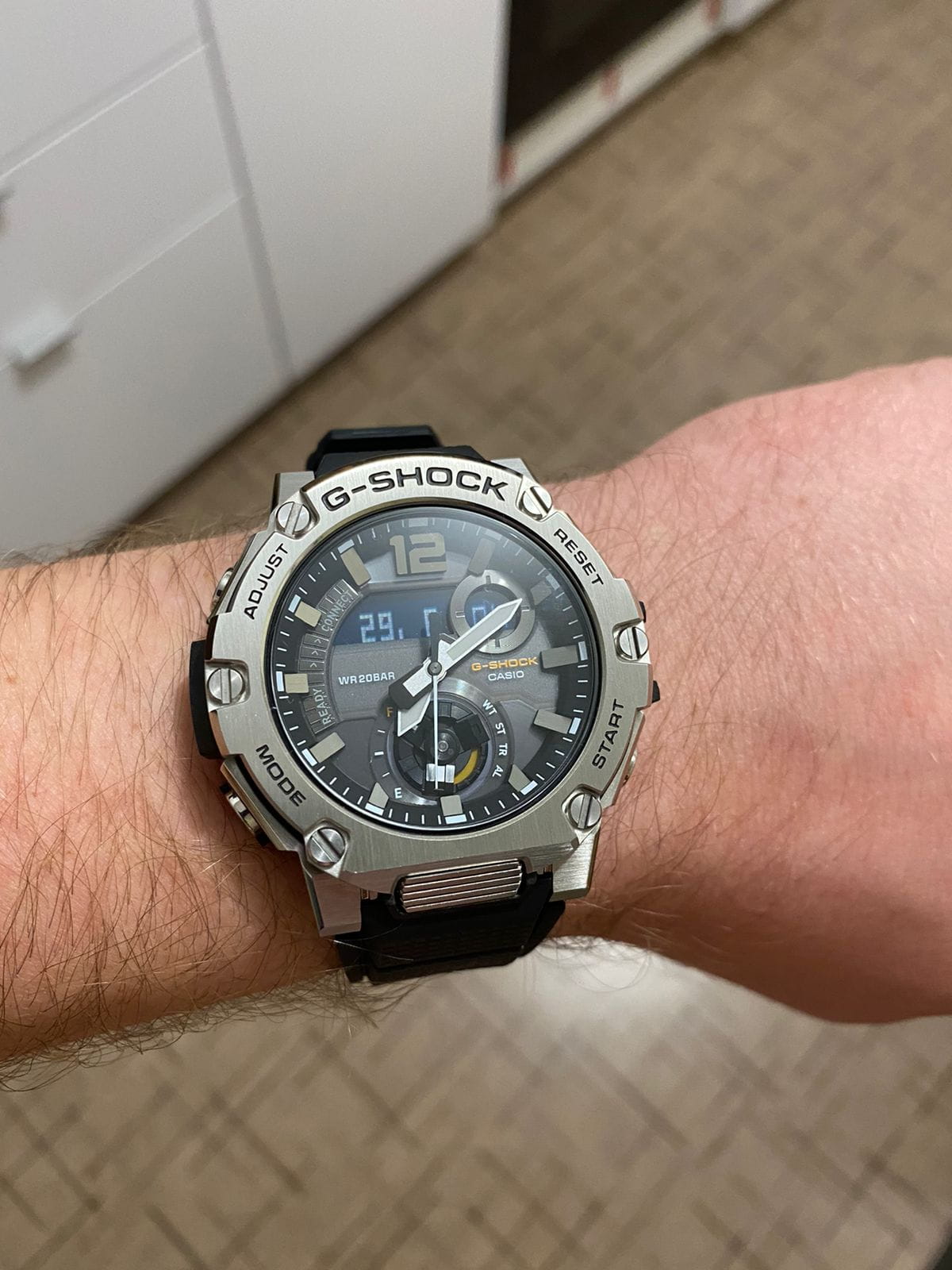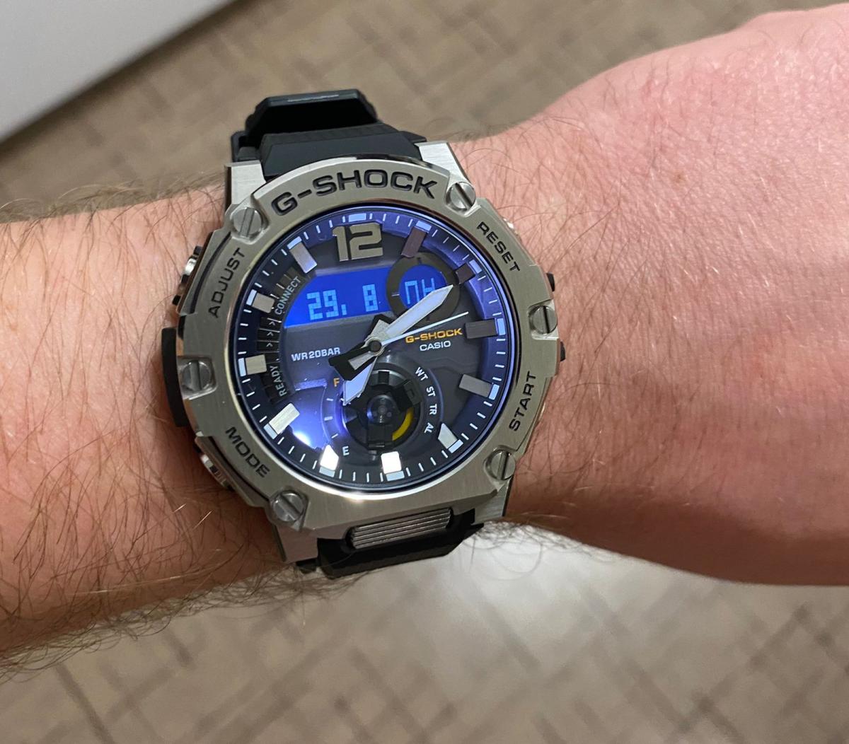 Корпус имеет структуру Carbon Core GuardCarbon Core Guard Новейшая структура корпуса, разработанная Casio. Полиуретановая пластина дополнительно усилена карбоновыми вставками, что придаёт специальную защиту от механических повреждений. Карбон отличается лёгкостью и прочностью., что говорит о повышенной ударопрочности. БезельБезельВнешний ободок, закрепляющий стекло. В спортивных часах так называется поворотное кольцо с делениями на циферблате, выполняет роль таймера – замеряет отрезки времени на шкале. Неподвижный безель – элемент декора. Однонаправленно вращающийся безель на дайверских часах позволяет фиксировать моменты погружения и выныривания на поверхность. изготовлен из стали 316L. Японский кварцевый механизм отличается высокой точностью хода 15 +/- секунд в месяц. Часы оснащены инновационной технологией , синхронизация со смартфоном происходит с помощью BluetoothBluetoothСовременная технология, позволяющая синхронизировать часы с телефоном и переносить данные. Часы с Bluetooth расширяют возможности вашего смартфона и делают его использование ещё более удобным.. Возможности: двойная автоматическая подсветка, мировое времяМировое время Полезное часовое усложнение, отображающее время в основных городах и известных областях по всему миру, оно связано с часовыми поясами, удобно для путешественников и бизнесменов. , будильник, хронографХронографФункция позволяет измерять отрезки времени с особой точностью: часы, минуты, секунды. Верным признаком хронографа является наличие на циферблате 3 дополнительных окошек-счётчиков., календарь, таймер.