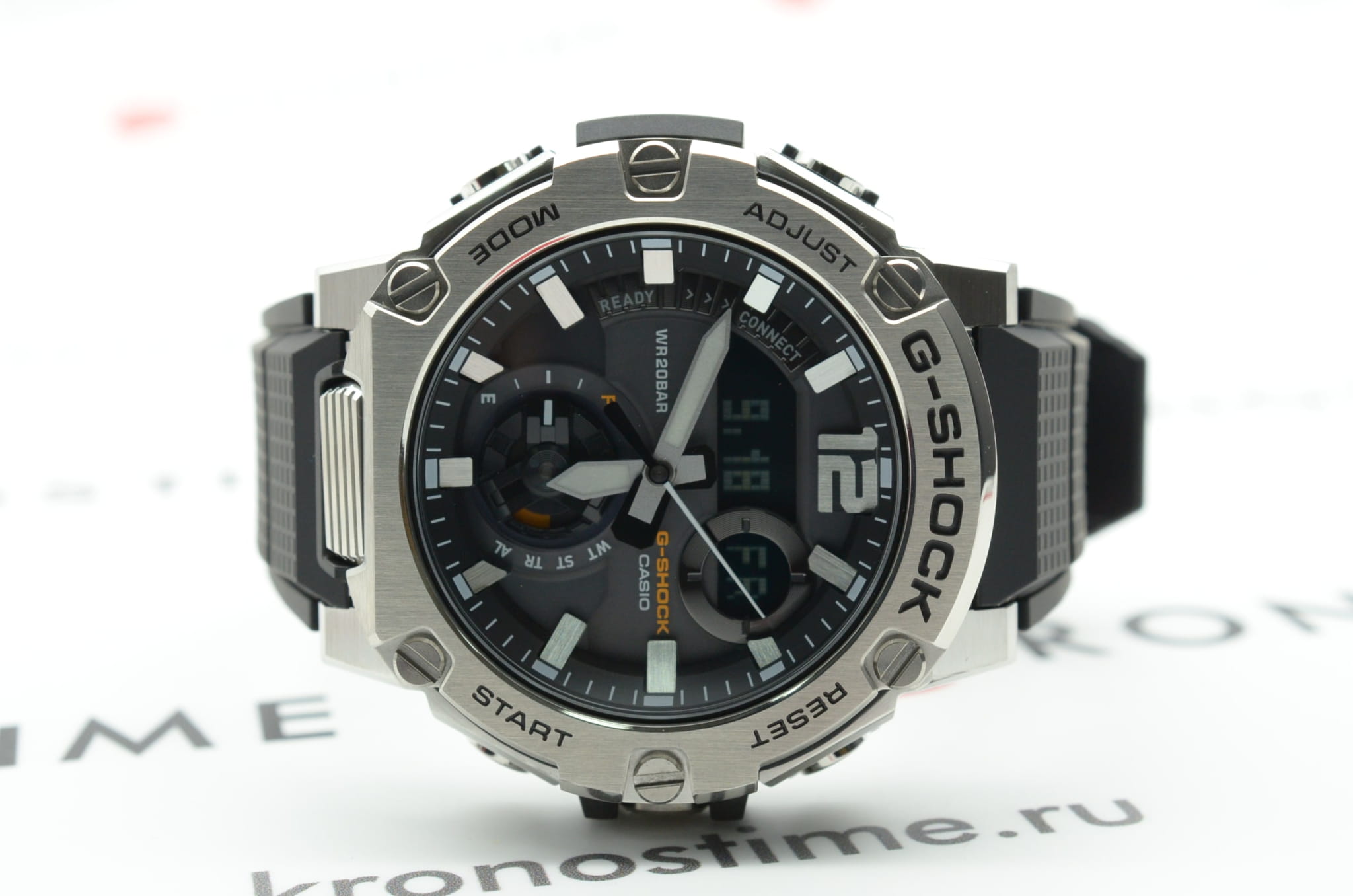 Корпус имеет структуру Carbon Core GuardCarbon Core Guard Новейшая структура корпуса, разработанная Casio. Полиуретановая пластина дополнительно усилена карбоновыми вставками, что придаёт специальную защиту от механических повреждений. Карбон отличается лёгкостью и прочностью., что говорит о повышенной ударопрочности. БезельБезельВнешний ободок, закрепляющий стекло. В спортивных часах так называется поворотное кольцо с делениями на циферблате, выполняет роль таймера – замеряет отрезки времени на шкале. Неподвижный безель – элемент декора. Однонаправленно вращающийся безель на дайверских часах позволяет фиксировать моменты погружения и выныривания на поверхность. изготовлен из стали 316L. Японский кварцевый механизм отличается высокой точностью хода 15 +/- секунд в месяц. Часы оснащены инновационной технологией , синхронизация со смартфоном происходит с помощью BluetoothBluetoothСовременная технология, позволяющая синхронизировать часы с телефоном и переносить данные. Часы с Bluetooth расширяют возможности вашего смартфона и делают его использование ещё более удобным.. Возможности: двойная автоматическая подсветка, мировое времяМировое время Полезное часовое усложнение, отображающее время в основных городах и известных областях по всему миру, оно связано с часовыми поясами, удобно для путешественников и бизнесменов. , будильник, хронографХронографФункция позволяет измерять отрезки времени с особой точностью: часы, минуты, секунды. Верным признаком хронографа является наличие на циферблате 3 дополнительных окошек-счётчиков., календарь, таймер.